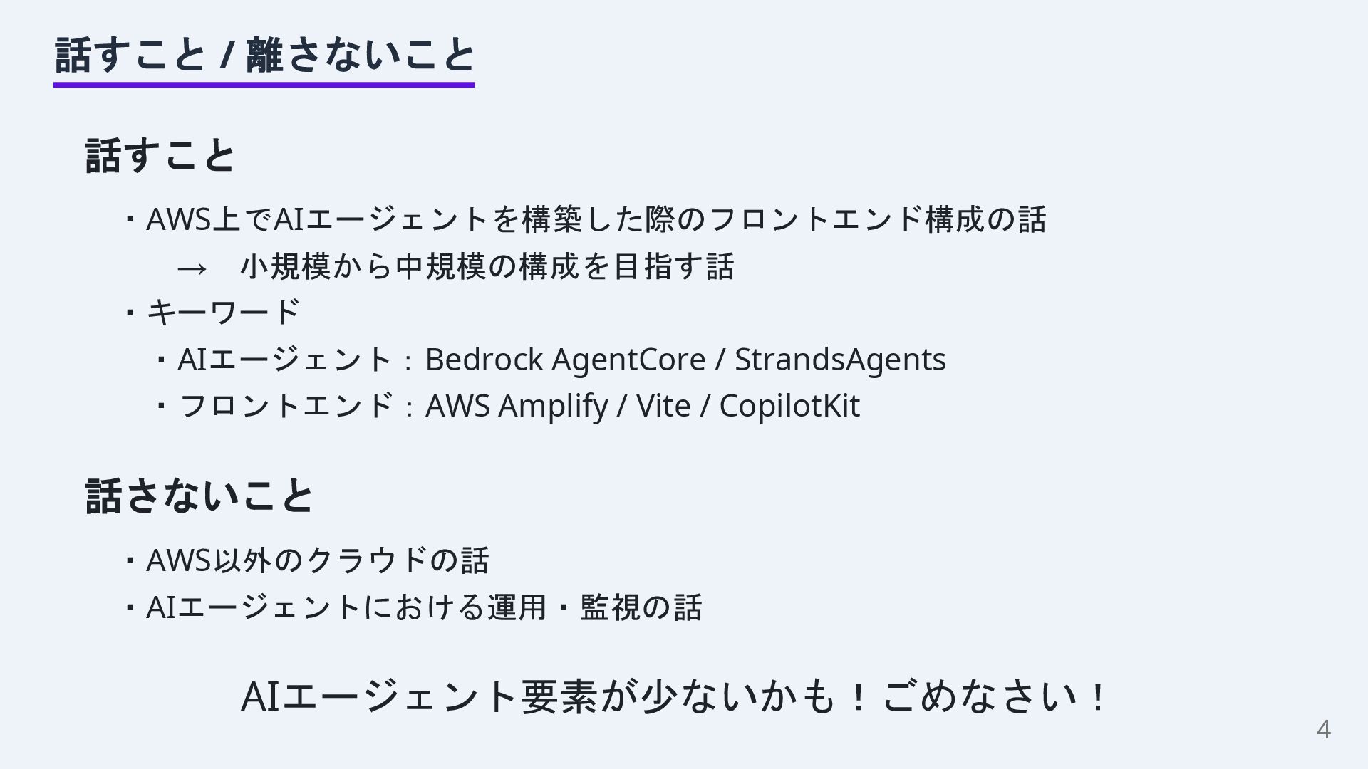 話すこと ・AWS上でAIエージェントを構築した際のフロントエンド構成の話 → 小規模から中規模の構成を目指す話 ・キーワード ・AIエージェント:Bedrock AgentCore / StrandsAgents ・フロントエンド:AWS