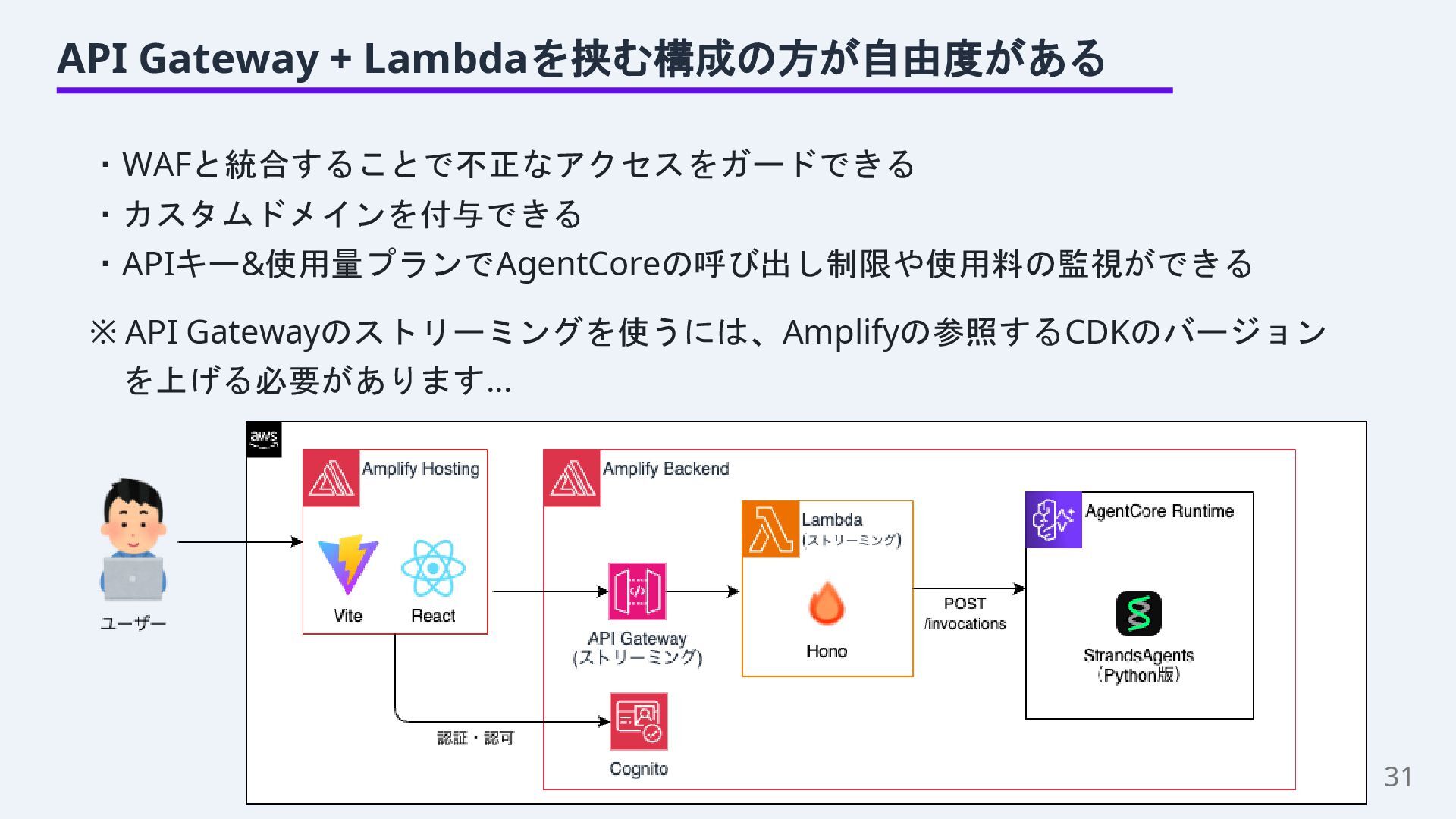 ・WAFと統合することで不正なアクセスをガードできる ・カスタムドメインを付与できる ・APIキー&使用量プランでAgentCoreの呼び出し制限や使用料の監視ができる ※ API Gatewayのストリーミングを使うには、Amplifyの参照するCDKのバージョン を上げる必要があります... API Gateway +