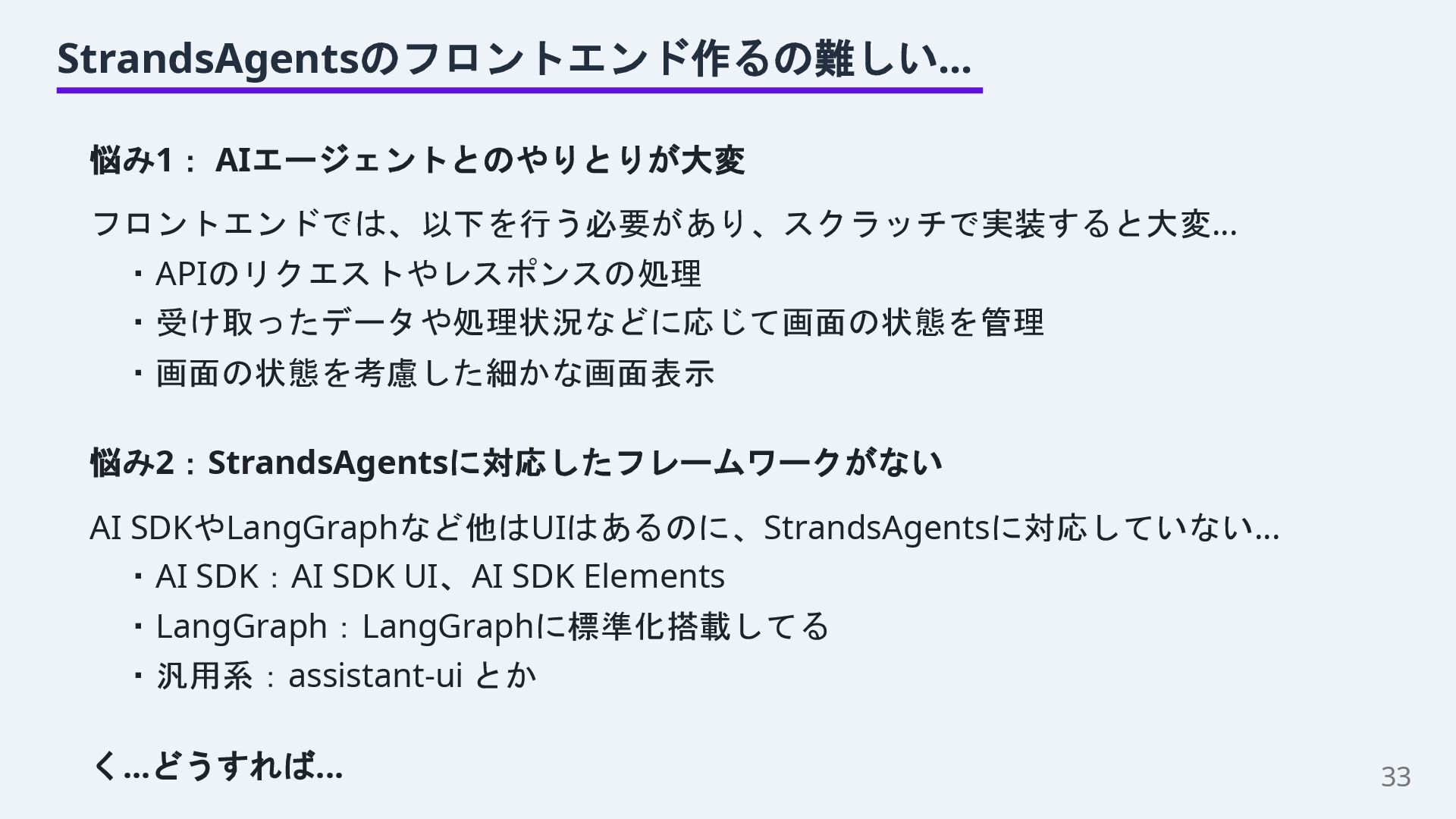 悩み1: AIエージェントとのやりとりが大変 フロントエンドでは、以下を行う必要があり、スクラッチで実装すると大変... ・APIのリクエストやレスポンスの処理 ・受け取ったデータや処理状況などに応じて画面の状態を管理 ・画面の状態を考慮した細かな画面表示 悩み2:StrandsAgentsに対応したフレームワークがない AI SDKやLangGraphなど他はUIはあるのに、StrandsAgentsに対応していない... ・AI