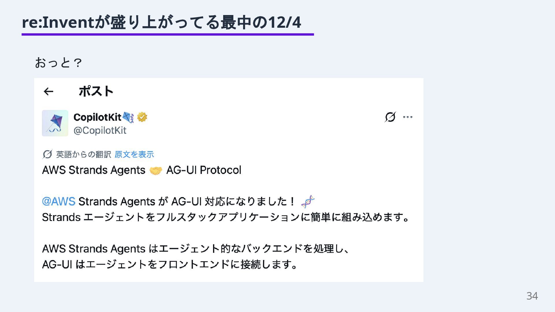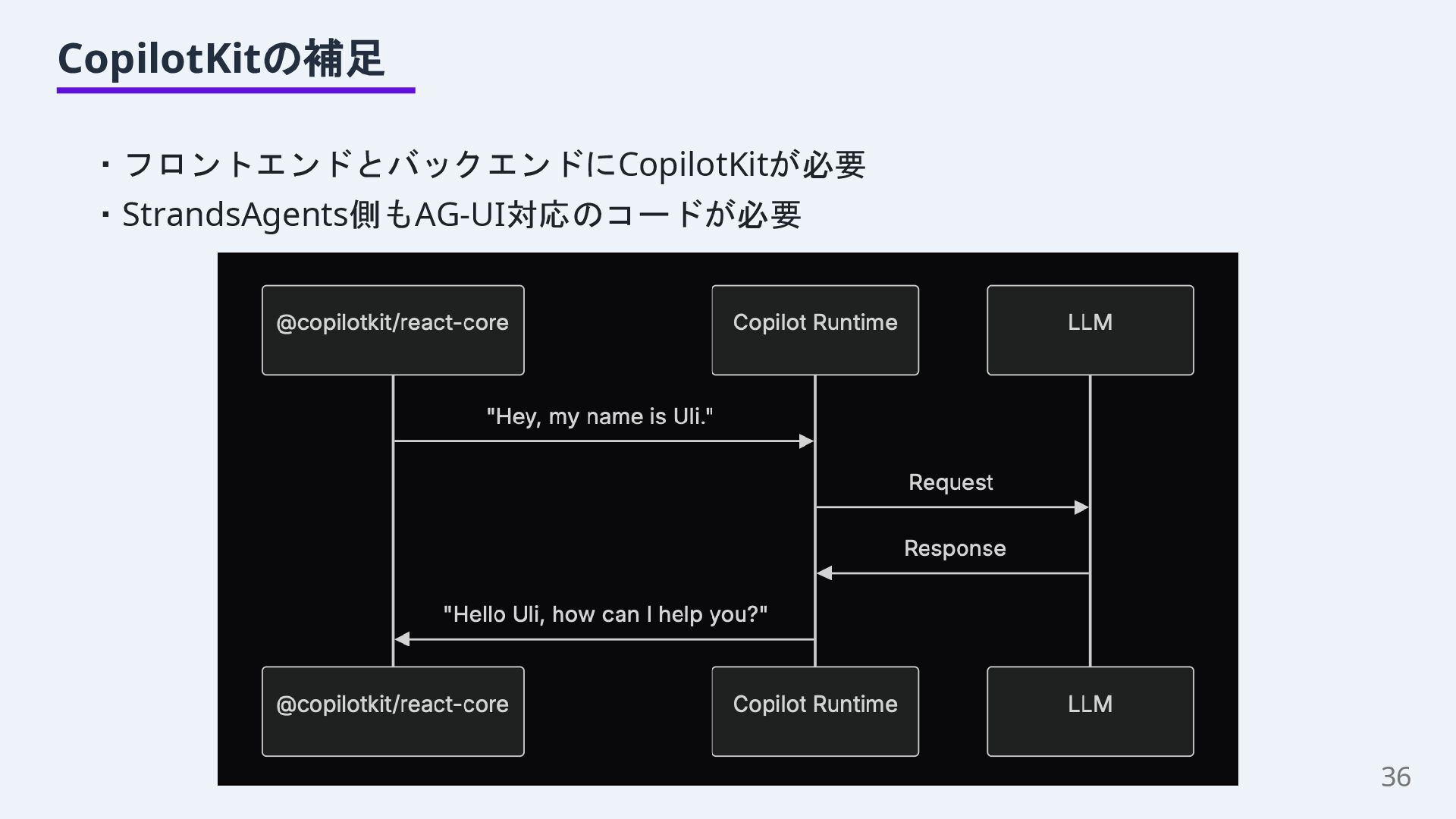 ・フロントエンドとバックエンドにCopilotKitが必要 ・StrandsAgents側もAG-UI対応のコードが必要 CopilotKitの補足 36