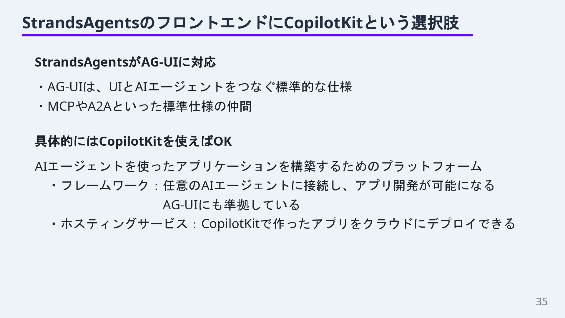 StrandsAgentsがAG-UIに対応 ・AG-UIは、UIとAIエージェントをつなぐ標準的な仕様 ・MCPやA2Aといった標準仕様の仲間 具体的にはCopilotKitを使えばOK AIエージェントを使ったアプリケーションを構築するためのプラットフォーム ・フレームワーク:任意のAIエージェントに接続し、アプリ開発が可能になる AG-UIにも準拠している ・ホスティングサービス:CopilotKitで作ったアプリをクラウドにデプロイできる StrandsAgentsのフロントエンドにCopilotKitという選択肢 35