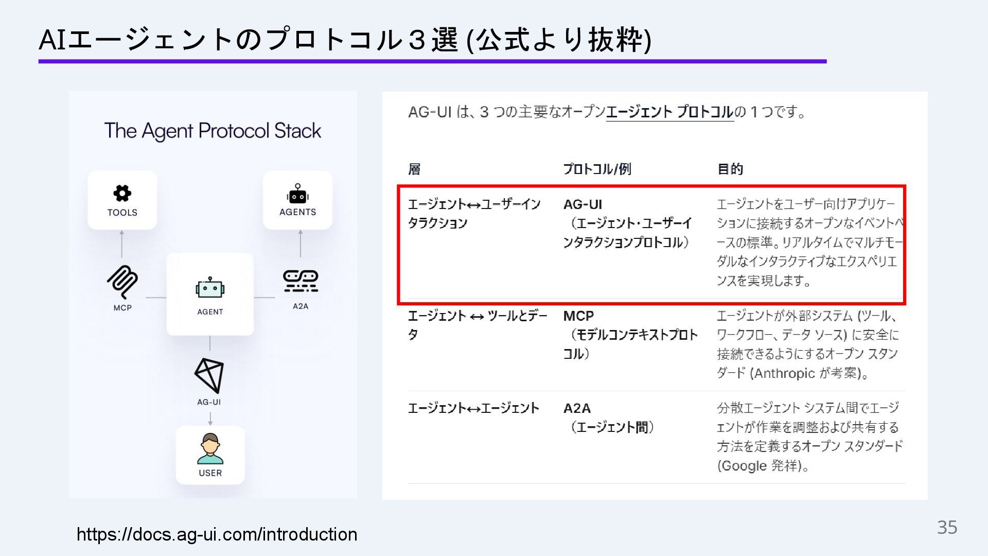 AIエージェントのプロトコル3選 (公式より抜粋) 35 https://docs.ag-ui.com/introduction