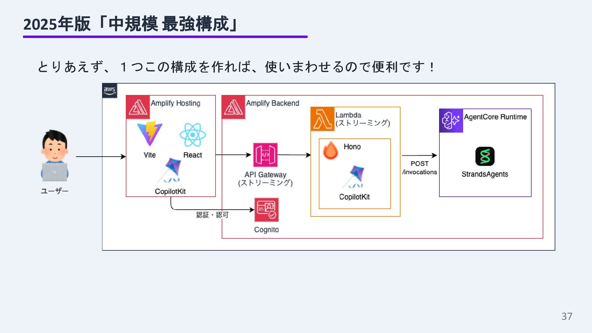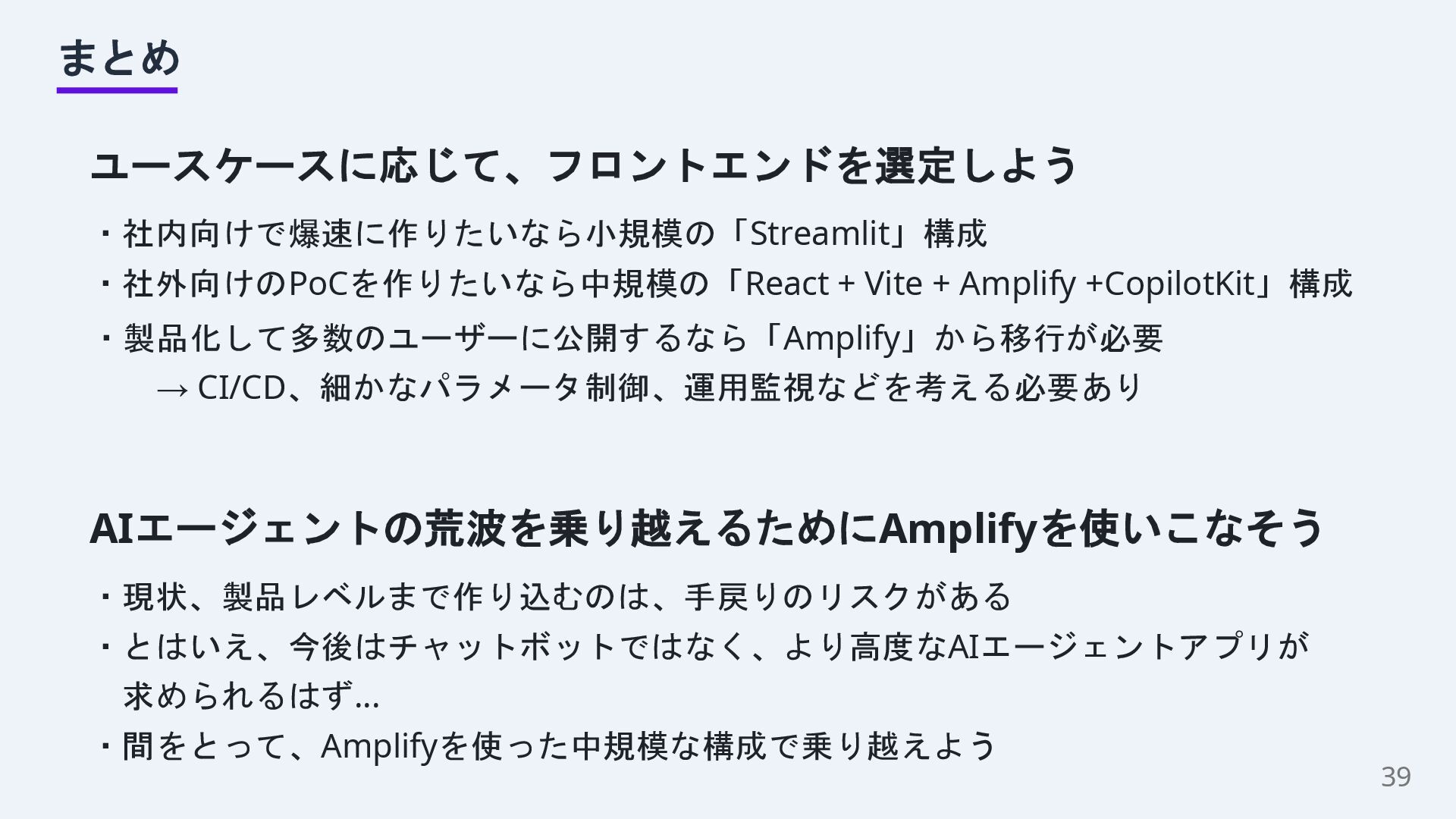 ユースケースに応じて、フロントエンドを選定しよう ・社内向けで爆速に作りたいなら小規模の「Streamlit」構成 ・社外向けのPoCを作りたいなら中規模の「React + Vite + Amplify +CopilotKit」構成 ・製品化して多数のユーザーに公開するなら「Amplify」から移行が必要 →