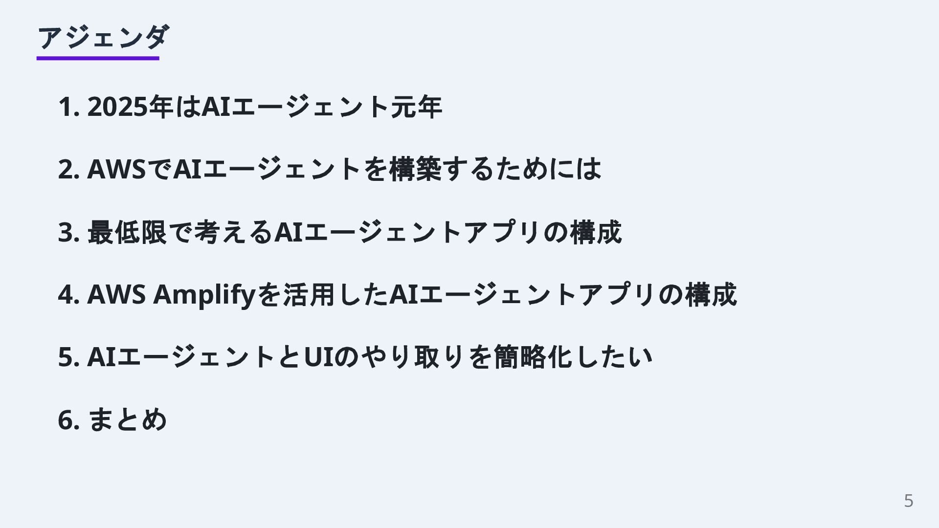 1. 2025年はAIエージェント元年 2. AWSでAIエージェントを構築するためには 3. 最低限で考えるAIエージェントアプリの構成 4. AWS Amplifyを活用したAIエージェントアプリの構成 5.