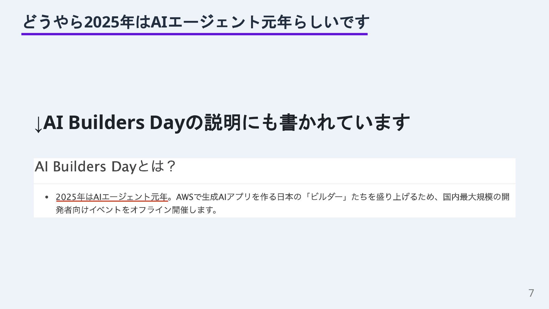 ↓AI Builders Dayの説明にも書かれています どうやら2025年はAIエージェント元年らしいです 7