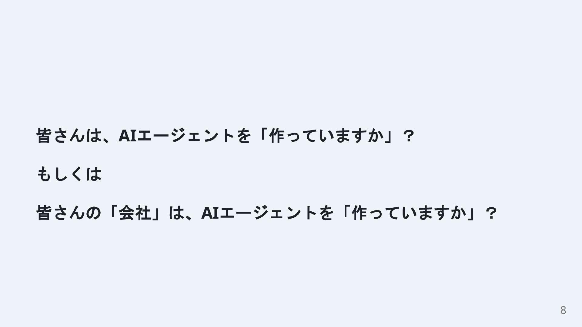 皆さんは、AIエージェントを「作っていますか」? もしくは 皆さんの「会社」は、AIエージェントを「作っていますか」? 8