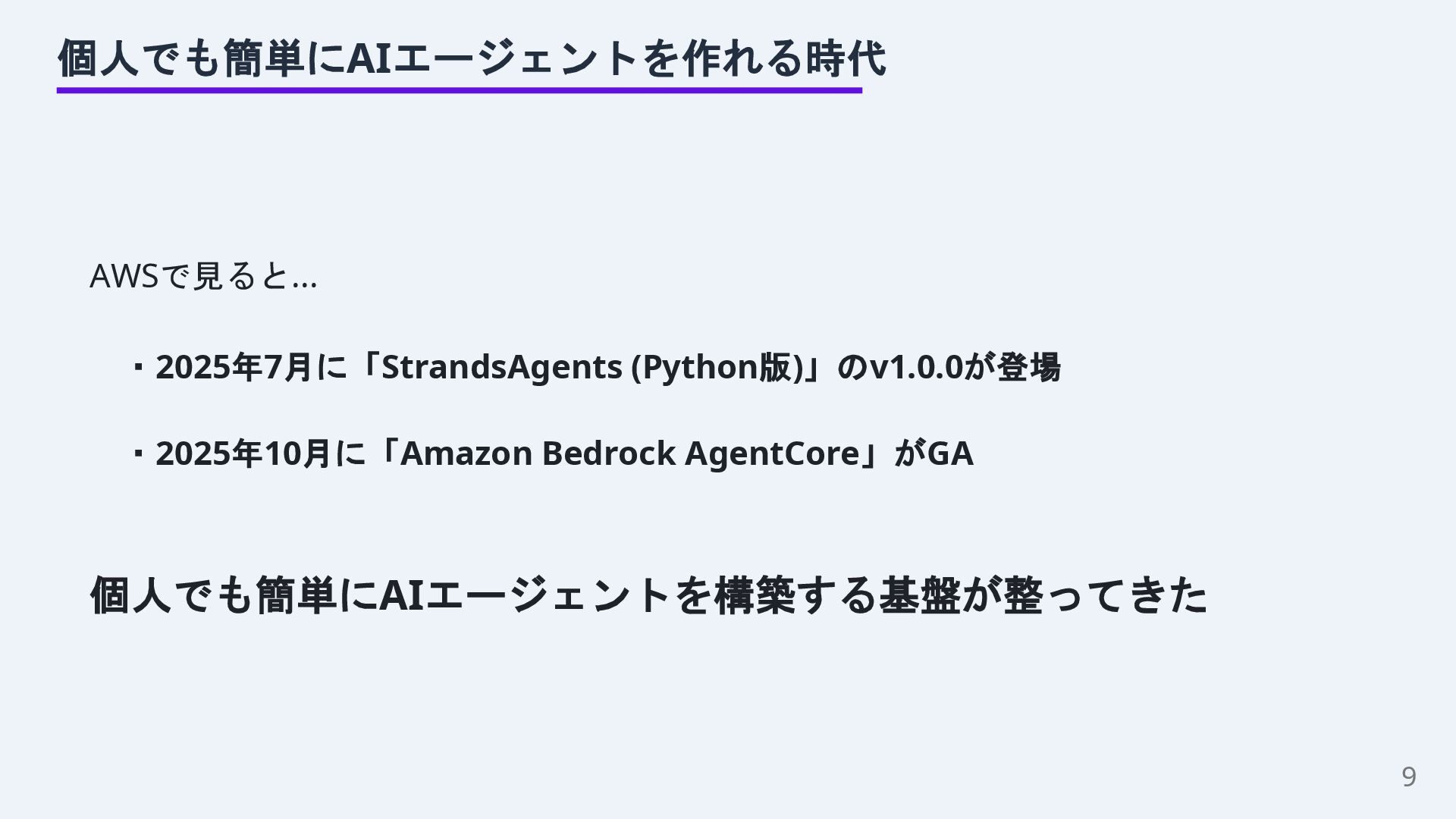 AWSで見ると... ・2025年7月に「StrandsAgents (Python版)」のv1.0.0が登場 ・2025年10月に「Amazon Bedrock AgentCore」がGA 個人でも簡単にAIエージェントを構築する基盤が整ってきた 個人でも簡単にAIエージェントを作れる時代 9