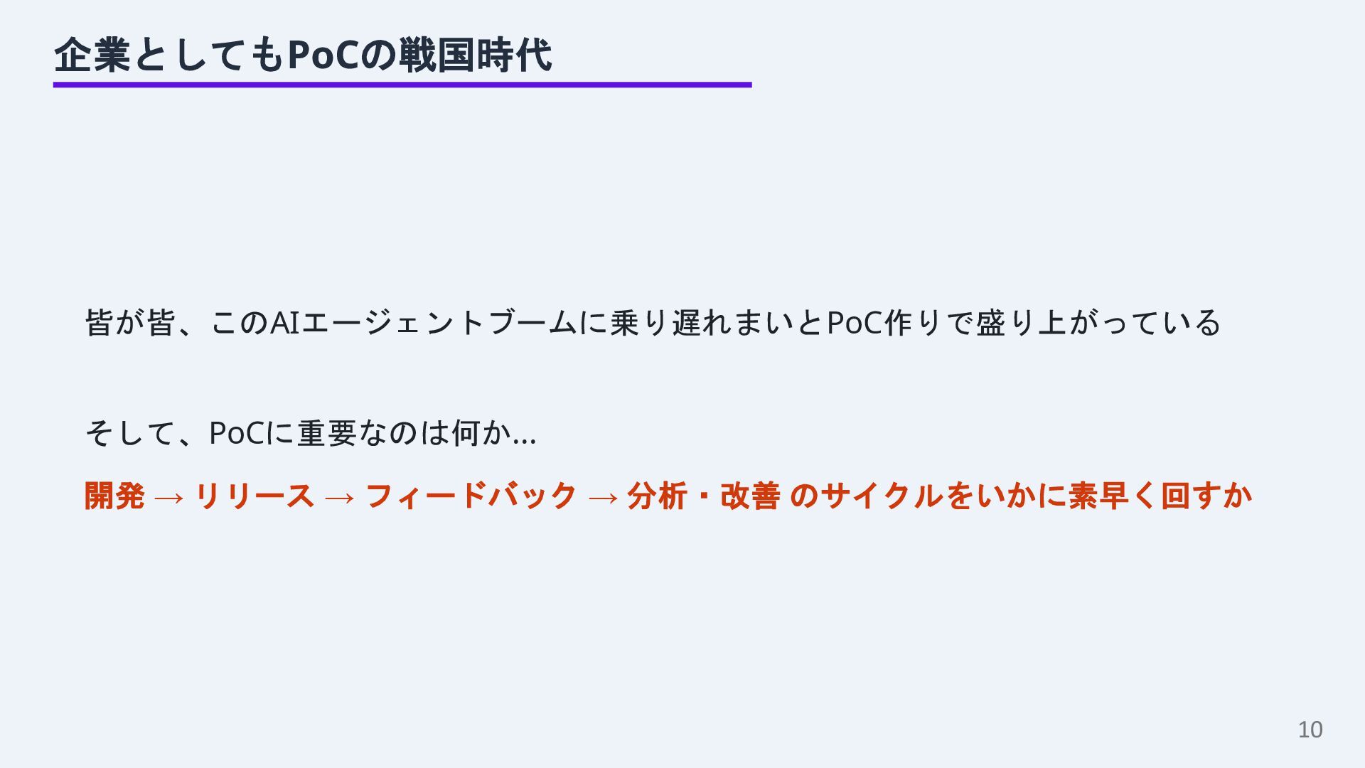 皆が皆、このAIエージェントブームに乗り遅れまいとPoC作りで盛り上がっている そして、PoCに重要なのは何か... 開発 → リリース → フィードバック → 分析・改善 のサイクルをいかに素早く回すか