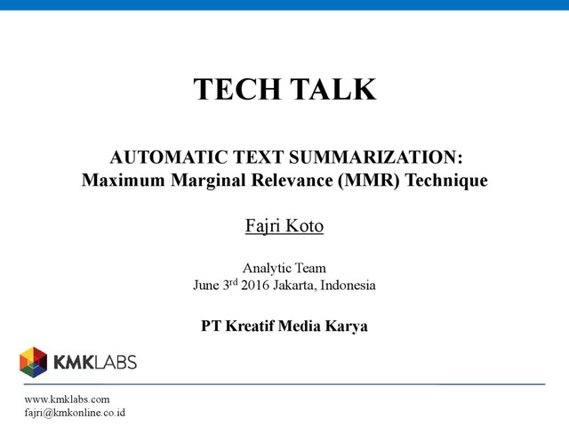Tech talk kali ini mengupas algoritma peringkasan teks otomatis yang lazim dibahas pada ranah NLP (Natural Language Processing). Sistem peringkasan teks merupakan sebuah sistem yang mampu meringkas dokumen menjadi kalimat-kalimat yang tergolong kepada inti sari atau topik pembicaraan dokumen. Sistem ini memungkinkan kita untuk mendapatkan kunci informasi dari sebuah dokumen secara cepat tanpa mengharuskan kita untuk membaca isi dokumen secara manual. Adapun sistem peringkasan yang dijelaskan pada tech talk kali ini adalah Maximum Marginal Relevance (MMR) yang tergolong kepada kategori peringkasan ekstraktif (memilih kalimat yang ada pada dokumen sebagai kalimat pokok dari isi dokumen). MMR dilakukan dengan melakukan pembobotan untuk setiap kalimat yang ada pada dokumen. Adapun pada tech talk ini, pembobotan dilakukan menggunakan vector space model berupa Term Frequency (TF) dan Cosine Similarity sebagai pengukuran similarity nya.