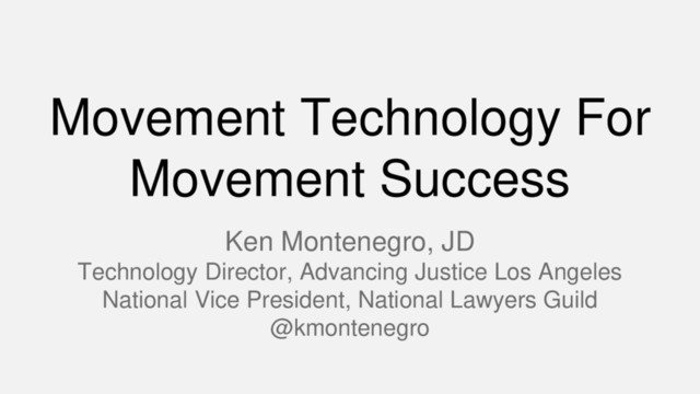 raised in a community of migrants Moment of political awakening was anti- Prop 187 work Nonprofit technologist for almost 20 years Extensive experience working with both funded and unfunded groups Professional Affiliations: Technology Director at Asian Americans Advancing Justice Los Angeles National Vice President of the National Lawyers Guild Board Member, Nonprofit Technology Network (NTEN) Board Member, Immigrant Defenders Law Center Co-founder Stop LAPD Spying Coalition
