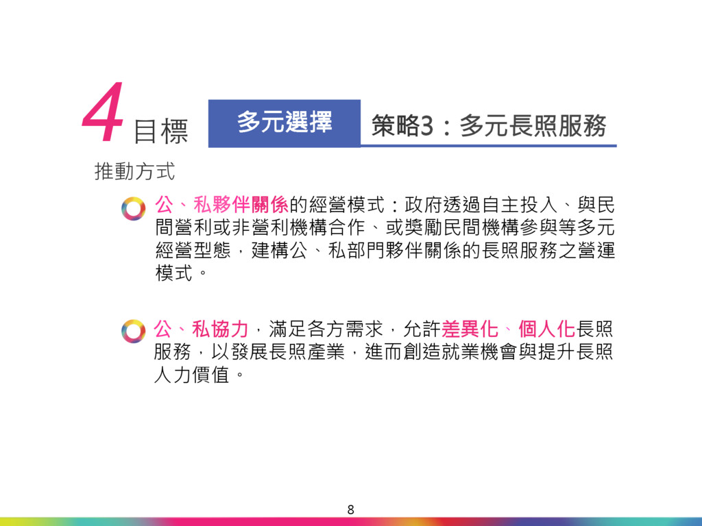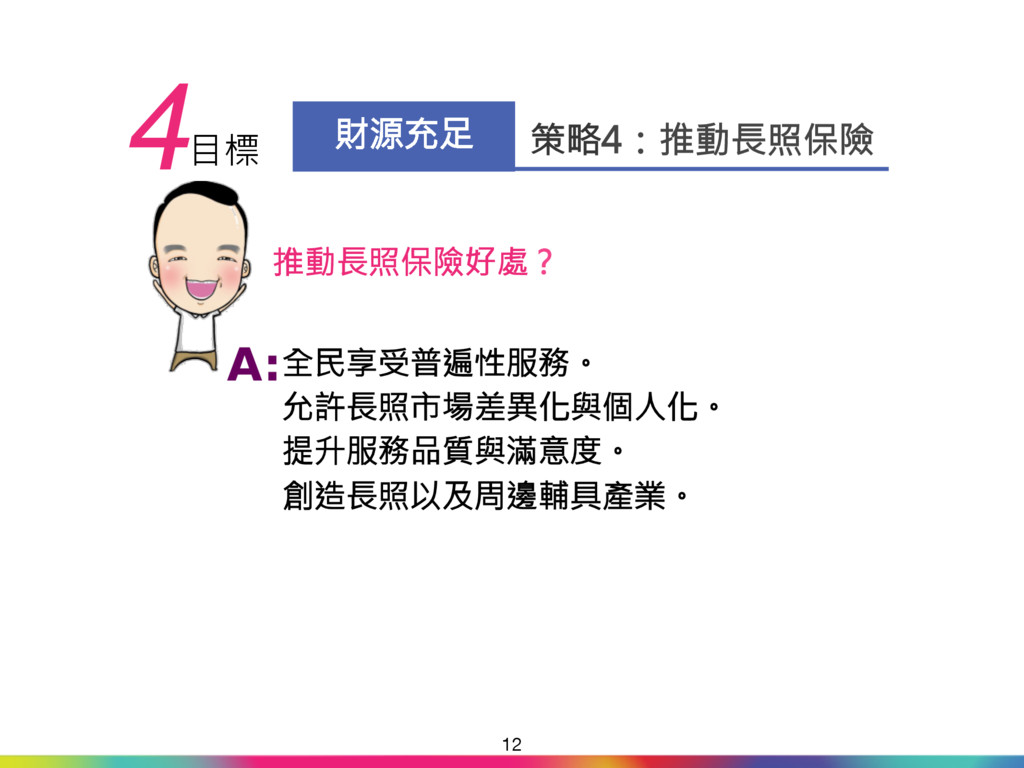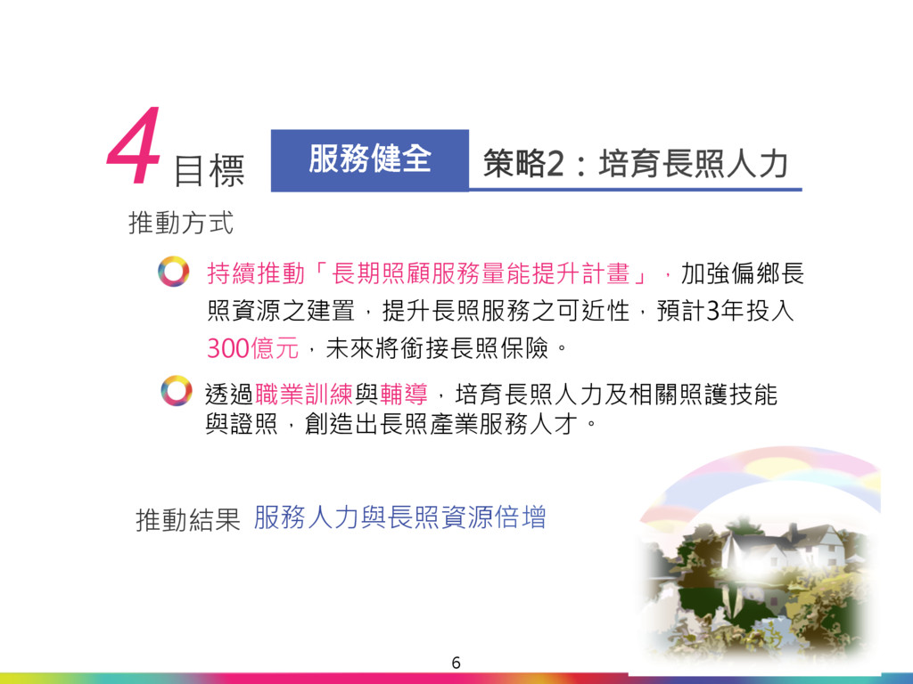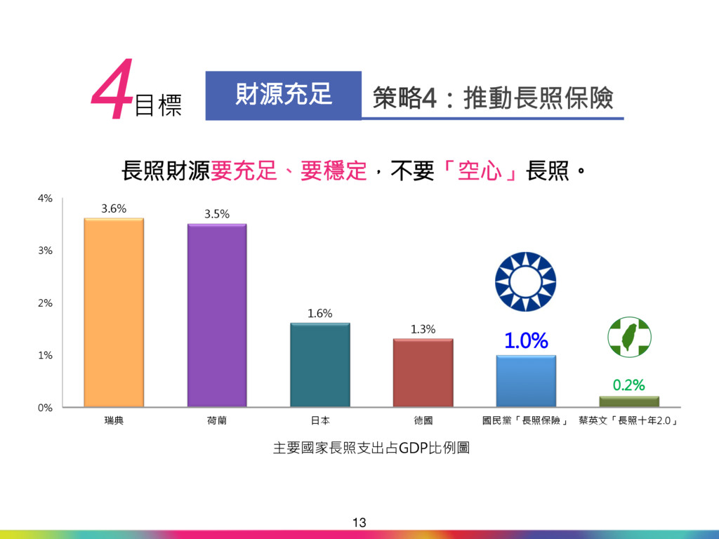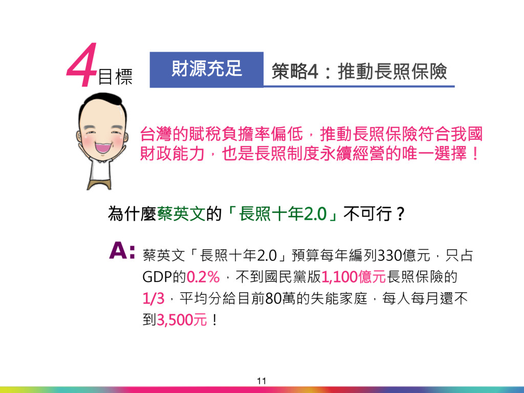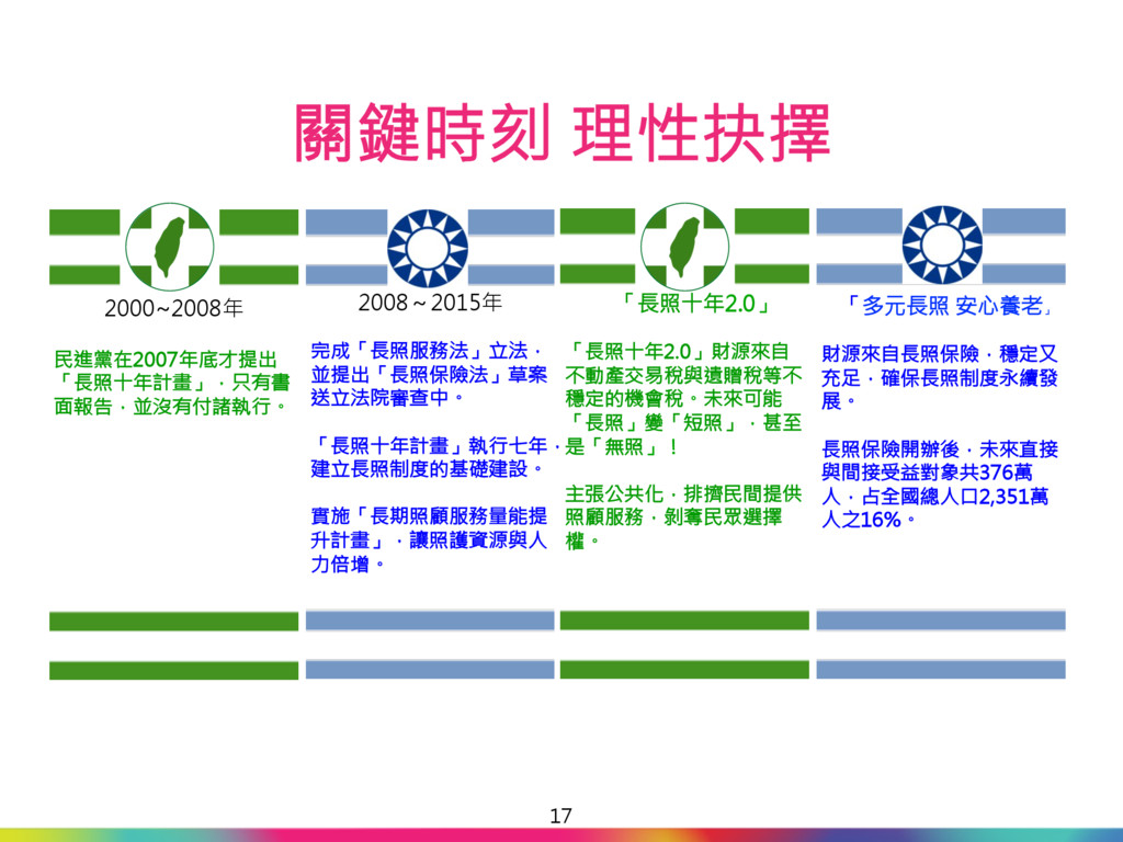 升計畫」,讓照護資源與人 力倍增。 「多元長照 安心養老」 財源來自長照保險,穩定又 充足,確保長照制度永續發 展。 長照保險開辦後,未來直接 與間接受益對象共376萬 人,占全國總人口2,351萬 人之16%。 關鍵時刻 理性抉擇 17 2000~2008年 民進黨在2007年底才提出 「長照十年計畫」,只有書 面報告,並沒有付諸執行。 「長照十年2.0」 「長照十年2.0」財源來自 不動產交易稅與遺贈稅等不 穩定的機會稅。未來可能 「長照」變「短照」,甚至 是「無照」! 主張公共化,排擠民間提供 照顧服務,剝奪民眾選擇 權。