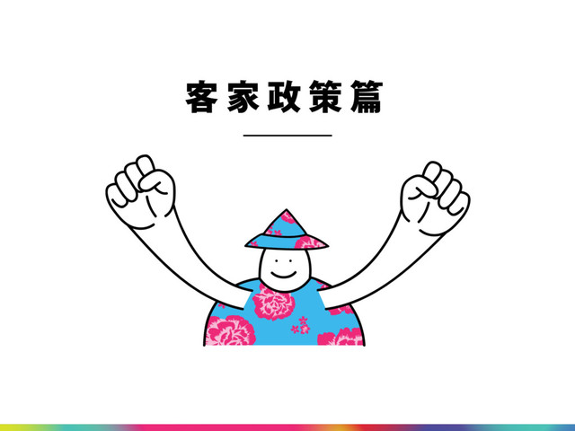 4 政策主張 1 推動客語扎根計畫 推動方式 鼓勵客家藝文創作與數位內容 培植優秀藝文展演團隊,鼓勵客家電視節目注入新元素,使用 網路科技擴大數位內容通路,以優質的教學及文化節目,吸引 年輕族群探索、學習客家語言與文化。 建構「客家學」知識體系
