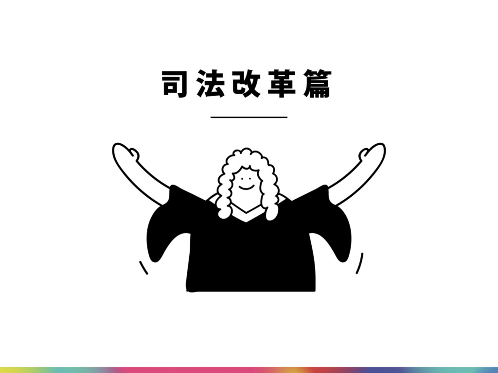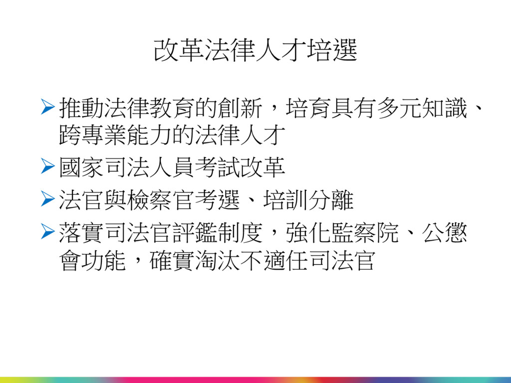 改革法律人才培選 Ø 推動法律教育的創新,培育具有多元知識、 跨專業能力的法律人才 Ø 國家司法人員考試改革 Ø 法官與檢察官考選、培訓分離 Ø 落實司法官評鑑制度,強化監察院、公懲 會功能,確實淘汰不適任司法官