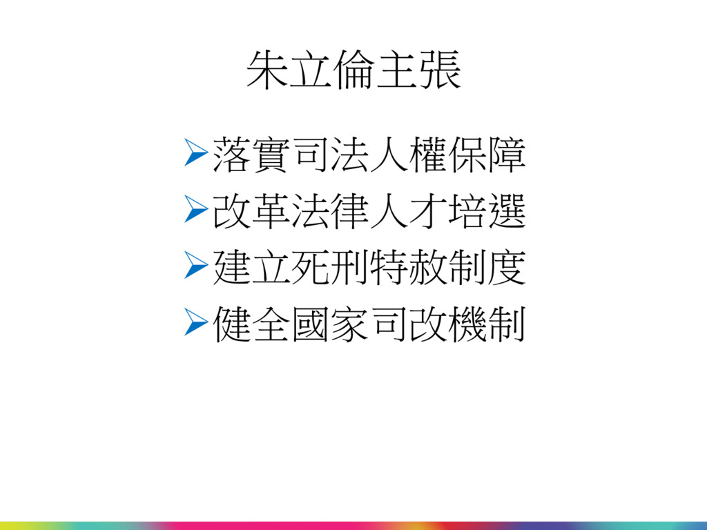 朱立倫主張 Ø 落實司法人權保障 Ø 改革法律人才培選 Ø 建立死刑特赦制度 Ø 健全國家司改機制