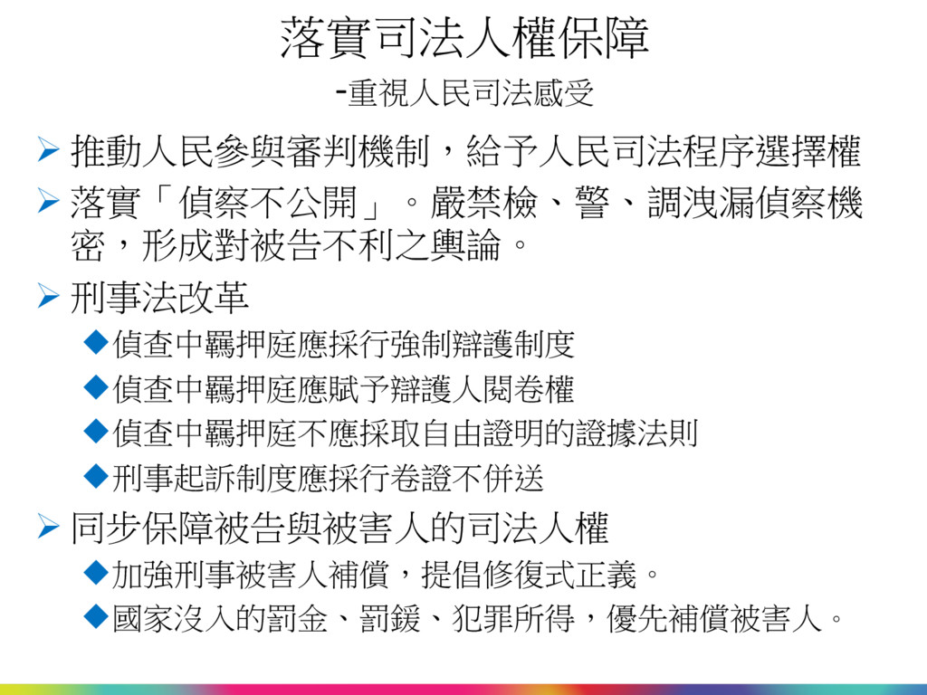 落實司法人權保障 -‐重視人民司法感受 Ø 推動人民參與審判機制,給予人民司法程序選擇權 Ø 落實「偵察不公開」。嚴禁檢、警、調洩漏偵察機 密,形成對被告不利之輿論。 Ø 刑事法改革