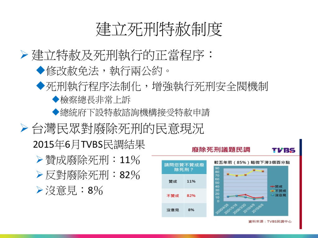 Ø 台灣民眾對廢除死刑的民意現況 2015年6月TVBS民調結果 Ø 贊成廢除死刑:11% Ø 反對廢除死刑:82% Ø 沒意見:8%