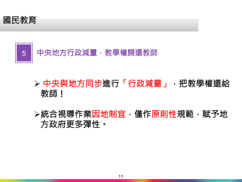 11 11 國民教育 5 中央地方行政減量,教學權歸還教師 Ø 中央與地方同步進行「行政減量」,把教學權還給 教師! Ø 統合視導作業因地制宜,僅作原則性規範,賦予地