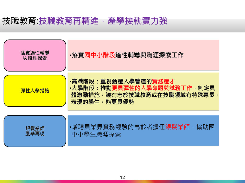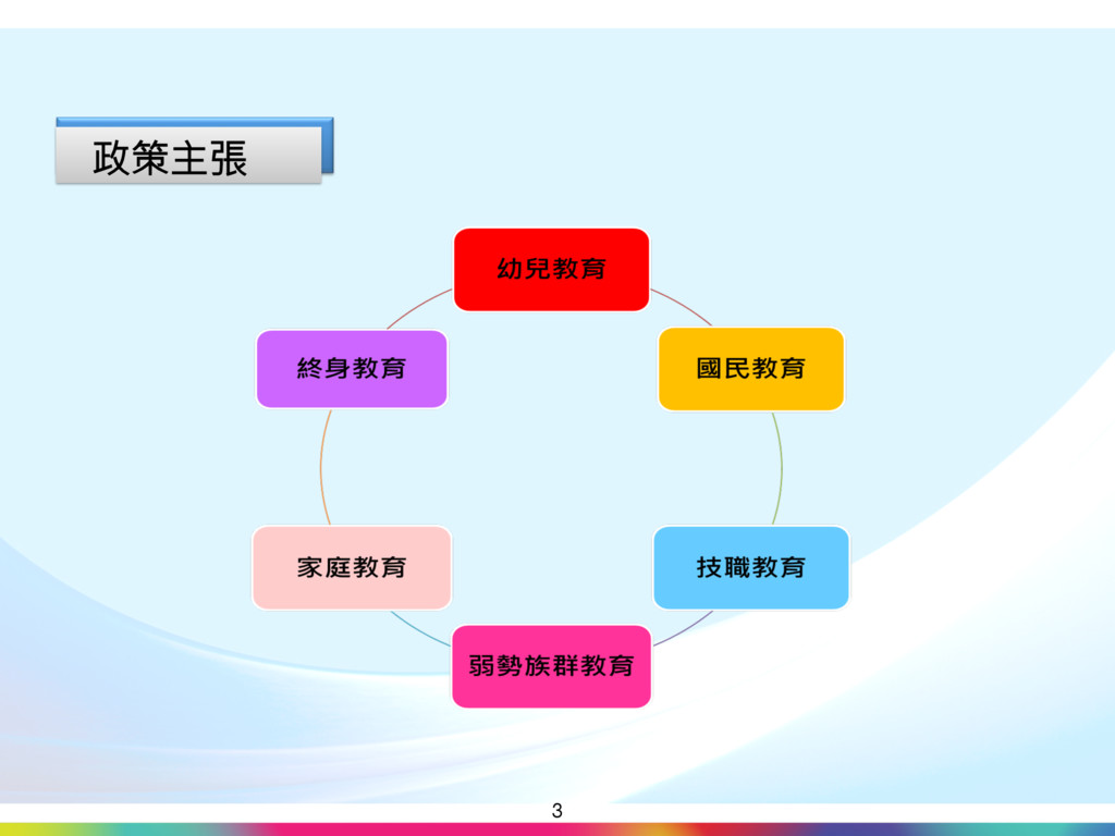 2 基本理念 優質教育 安心成長、適性發展 合理公平 全齡教育 公平公正,簡化制度 多元發展,學職並重 前瞻領航,終生學習