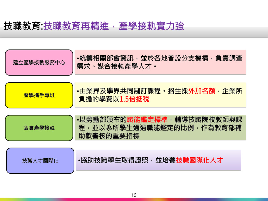 12 技職教育:技職教育再精進,產學接軌實力強 • 落實國中小階段適性輔導與職涯探索工作 落實適性輔導 與職涯探索 彈性入學措施 • 高職階段:重視甄選入學管道的實務選才 • 大學階段:推動更具彈性的入學命題與試務工作,制定具 體激勵措施,讓有志於技職教育或在技職領域有特殊專長、 表現的學生,能更具優勢