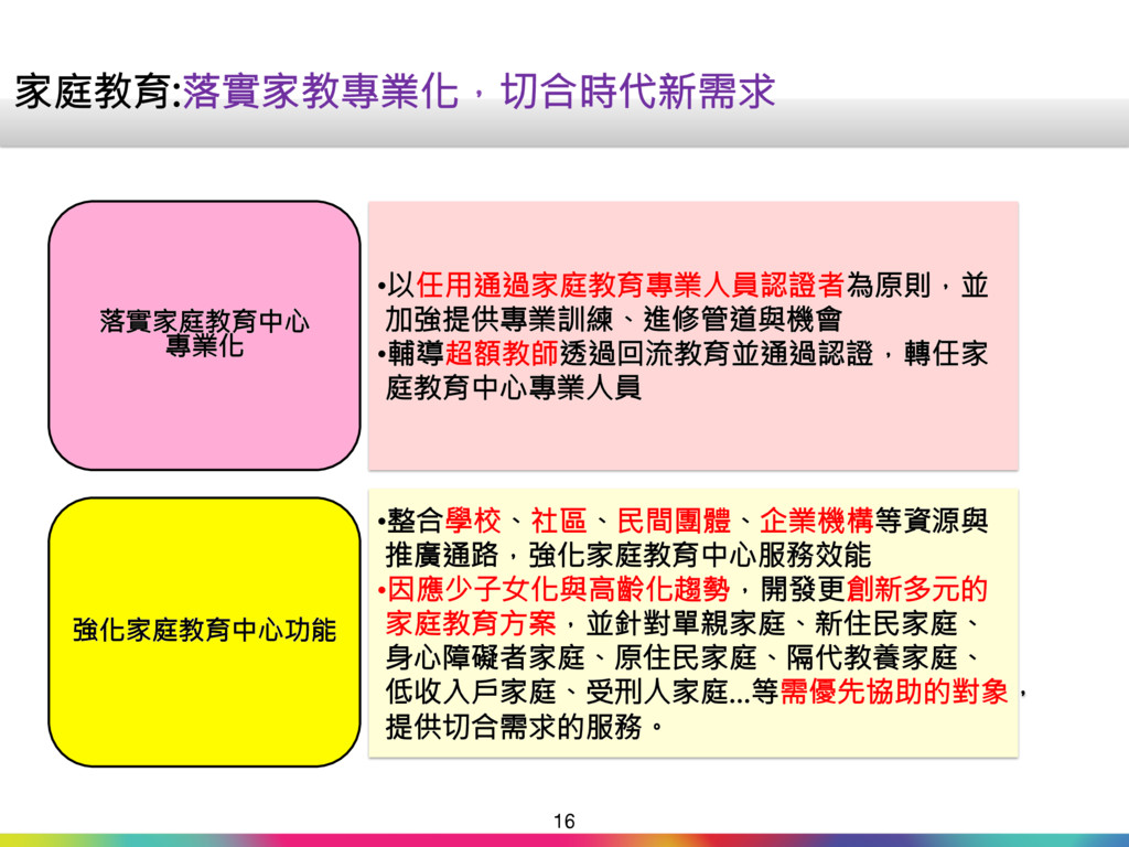 推廣通路,強化家庭教育中心服務效能 • 因應少子女化與高齡化趨勢,開發更創新多元的 家庭教育方案,並針對單親家庭、新住民家庭、 身心障礙者家庭、原住民家庭、隔代教養家庭、 低收入戶家庭、受刑人家庭…等需優先協助的對象, 提供切合需求的服務。