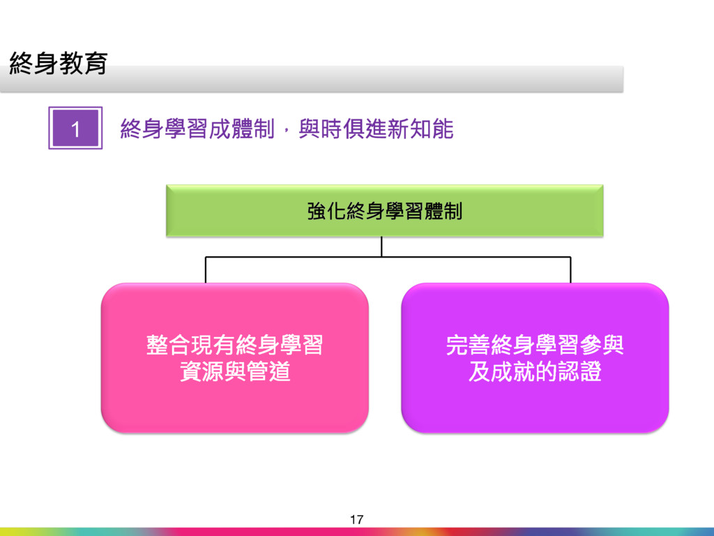 17 終身教育 1 終身學習成體制,與時俱進新知能 強化終身學習體制 整合現有終身學習 資源與管道 完善終身學習參與 及成就的認證