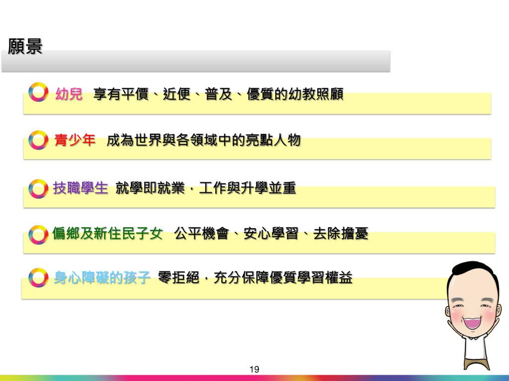 19 幼兒 享有平價、近便、普及、優質的幼教照顧 願景 青少年 成為世界與各領域中的亮點人物 技職學生 就學即就業,工作與升學並重 身心障礙的孩子 零拒絕,充分保障優質學習權益