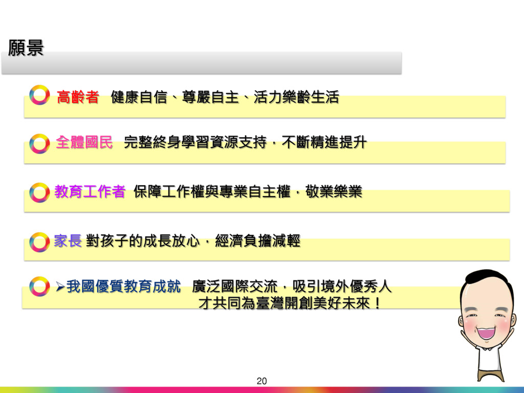 20 高齡者 健康自信、尊嚴自主、活力樂齡生活 願景 全體國民 完整終身學習資源支持,不斷精進提升 教育工作者 保障工作權與專業自主權,敬業樂業 Ø 我國優質教育成就 廣泛國際交流,吸引境外優秀人