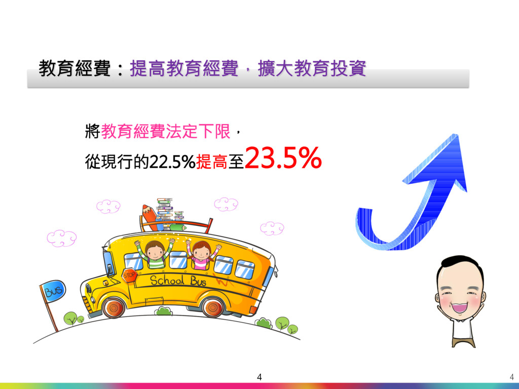 4 4 教育經費:提高教育經費,擴大教育投資 將教育經費法定下限, 從現行的22.5%提高至 23.5%