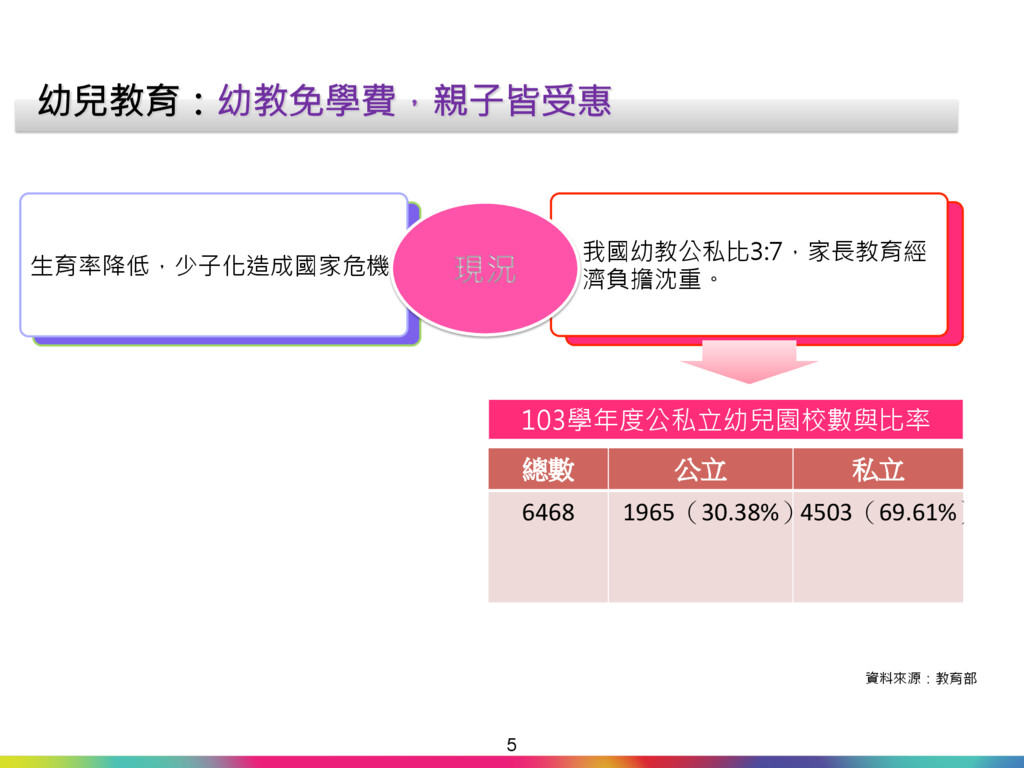 5 幼兒教育:幼教免學費,親子皆受惠 生育率降低,少子化造成國家危機。 我國幼教公私比3:7,家長教育經 濟負擔沈重。 103學年度公私立幼兒園校數與比率 總數 公立 私立 6468