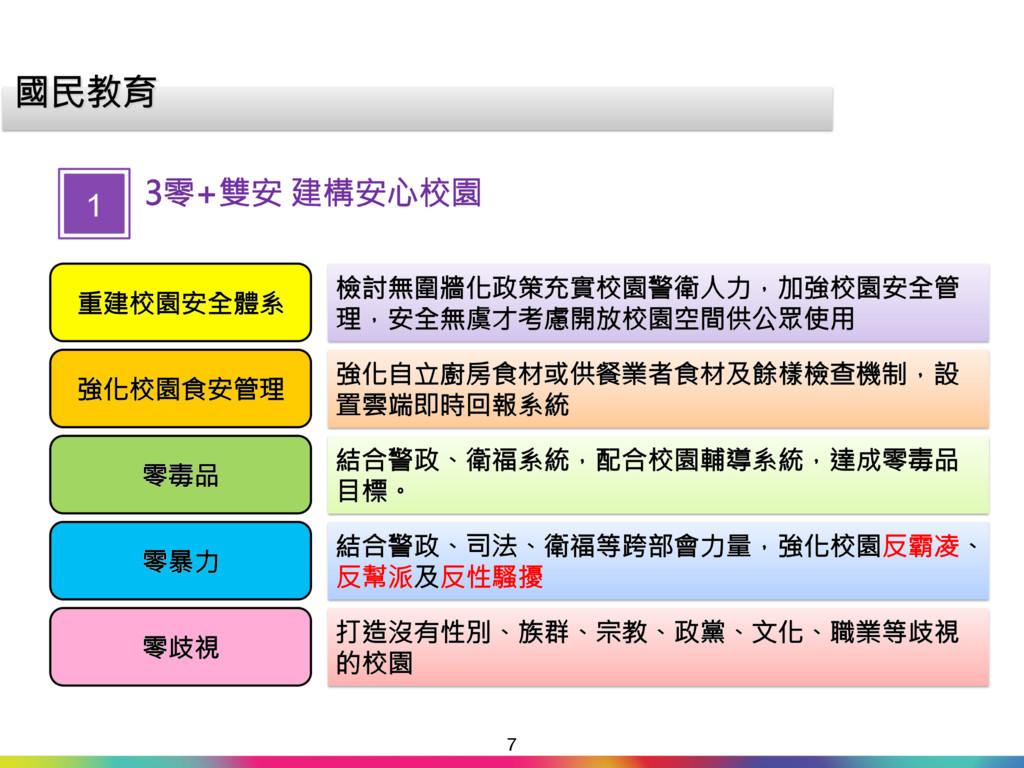 7 結合警政、司法、衛福等跨部會力量,強化校園反霸凌、 反幫派及反性騷擾 打造沒有性別、族群、宗教、政黨、文化、職業等歧視 的校園 國民教育 3零+雙安 建構安心校園 檢討無圍牆化政策充實校園警衛人力,加強校園安全管 理,安全無虞才考慮開放校園空間供公眾使用