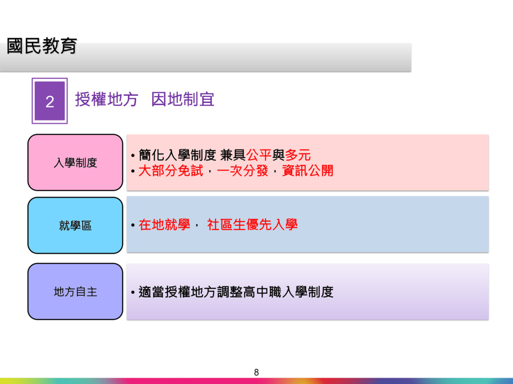 8 國民教育 授權地方 因地制宜 2 入學制度 • 簡化入學制度 兼具公平與多元 •