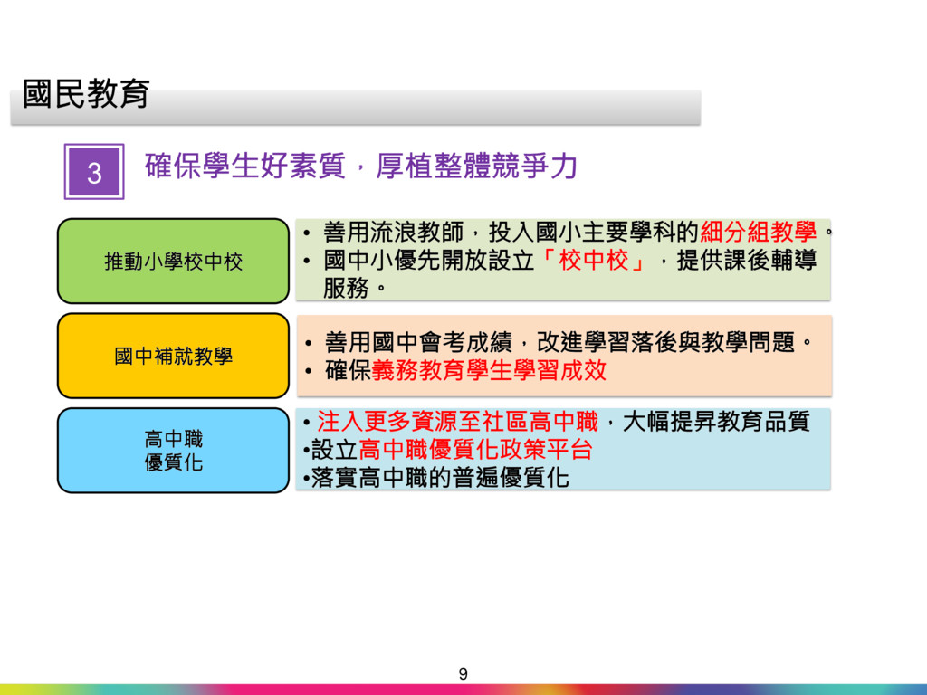 國中補就教學 高中職 優質化 • 善用國中會考成績,改進學習落後與教學問題。 • 確保義務教育學生學習成效 • 注入更多資源至社區高中職,大幅提昇教育品質 • 設立高中職優質化政策平台 • 落實高中職的普遍優質化
