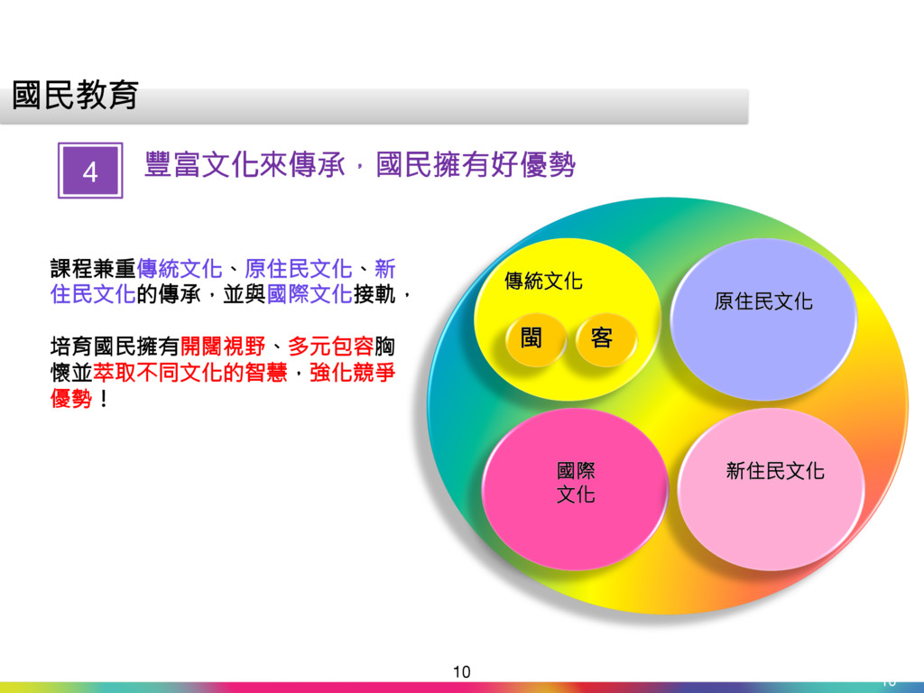 10 10 國民教育 4 豐富文化來傳承,國民擁有好優勢 課程兼重傳統文化、原住民文化、新 住民文化的傳承,並與國際文化接軌, 培育國民擁有開闊視野、多元包容胸 懷並萃取不同文化的智慧,強化競爭