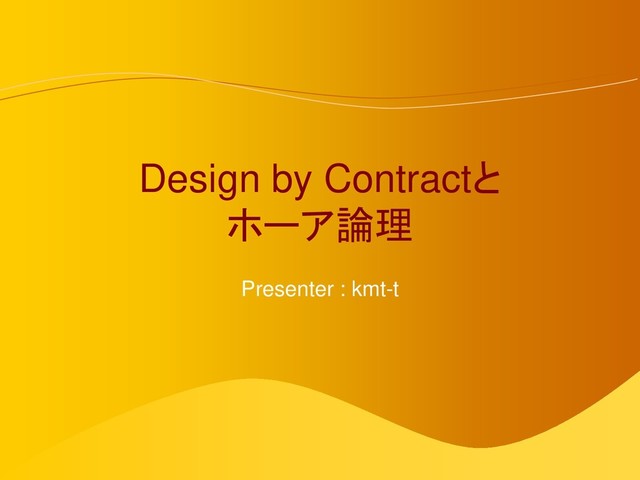 by Contractは数学的なバックグラウンドを持つ • Design by Contractはホーア論理 (または公理的意味論) をベースにした形式仕 様記述をカジュアル化したもの Design by Contractは形式仕様記述をカジュアルにしたもの 形式仕様記述とは • ある決まった規則を適用することができる手法を形式手法と言う – 人間よりコンピュータで処理しやすい場合が比較的多い • ここで言うホーア論理をベースとした形式仕様記述では仕様 (事前条件、事後条件、 不変条件) を満たすことを証明することで、プログラムの正当性を証明できる • ホーア論理をベースとした形式仕様記述の言語の例 – Z言語 – VDM/VDM SL/VDM++ – OCL (UMLの仕様に含まれる、形式仕様記述言語)