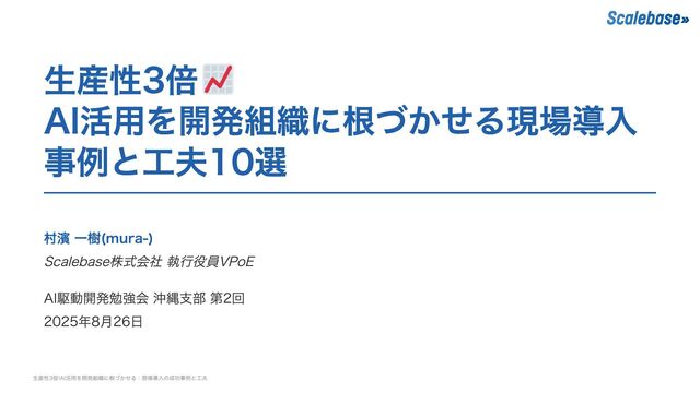 生産性3倍 AI活用を開発組織に根づかせる現場導入 事例と工夫10選 村濱 一樹(mura-) Scalebase株式会社 執行役員VPoE AI駆動開発勉強会 沖縄支部 第2回