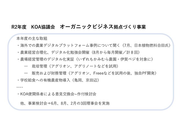 KOA協議会ではR2年度の国のオーガニックビジネス実践拠点づくり事業に採択されていましたが、コロナの影響などもあり、また運営側の負担軽減の意味もあって、活動範囲を限定した形で進めてきました。