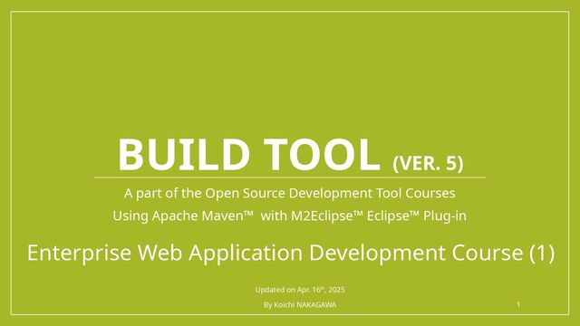 This is the updated version of the first course of a series of the courses for Enterprise Web Application development based on several Open Source products. As open source development tools, we are going to take care of Apache Maven as a build tool, Git as a version control tool and JUnit5 as a test tool. After then, we are going into the Jakarta EE framework. Therefore this series requires the basic skills of Ubuntu Desktop 24.04 LTS, Ubuntu Server 24.04 LTS, Eclipse IDE, Java SE (Oracle JDK, Open JDK), Payara Server and PostgreSQL. Regarding the Payara Server, we can use another Web Application Server conforming to Jakarta EE specification. As for PostgreSQL, we might be able to use another RDBMS product instead. We can also make use of another Linux distribution instead of Ubuntu.