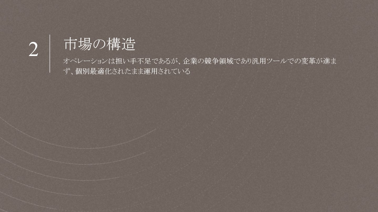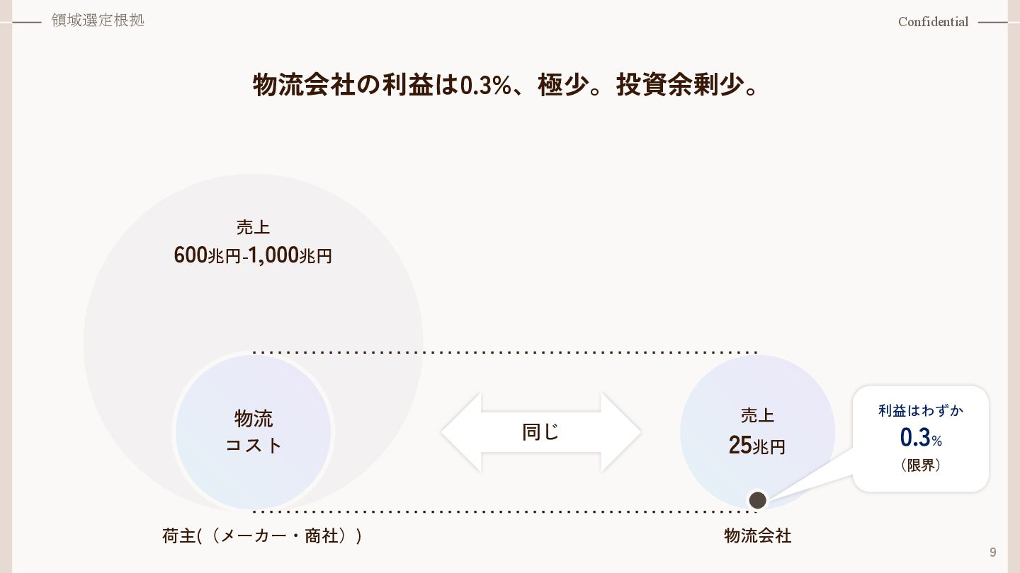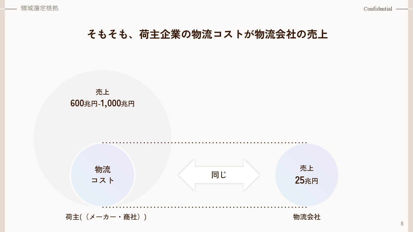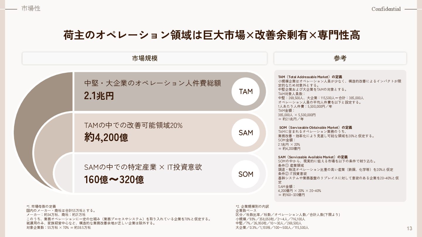 約4,200億 中堅・大企業のオペレーション人件費総額 2.1兆円 市場規模 参考 TAM(Total Addressable Market)の定義 小規模企業はオペレーション人員が少なく、構造的改善によるインパクトが限 定的なため対象外とする。 中堅企業および大企業をTAMの対象とする。 TAM対象人員数: 中堅:269,500人、大企業:115,500人=合計:385,000人 オペレーション人員の平均人件費を以下と設定する。 1人あたり人件費:5,500,000円/年 TAM金額: 385,000人 × 5,500,000円 = 約2.1兆円/年 SOM(Serviceable Obtainable Market)の定義 TAMに含まれるオペレーション業務のうち、 業務改善・効率化により見直し可能な領域を20%と仮定する。 SOM金額: 2.1兆円 × 20% = 約4,200億円 SAM(Serviceable Available Market)の定義 SOMの中から、現実的に狙える市場を以下の条件で絞り込む。 条件① 産業領域 調達・物流オペレーション比重の高い産業(鉄鋼、化学等)を20%と仮定 条件② IT投資意欲 基幹システムや業務基盤のリプレイスに対して意欲のある企業を20~40%と仮 定 SAM金額: 4,200億円 × 20% × 20~40% = 約160~320億円 荷主のオペレーション領域は巨大市場×改善余剰有×専門性高 *2. 企業規模別の内訳 企業数ベース 区分/社数比率/社数/オペレーション人数/合計人数(下限より) 小規模/93%/358,050社/2〜4人/716,100人 中堅/7%/26,950社/10〜30人/269,500人 大企業/0.3%/1,155社/100〜500人/115,500人 *1. 市場母数の定義 国内のメーカー・商社は合計55万社とする。 メーカー:約34万社、商社:約21万社 このうち、業務オペレーションに一定の仕組み(業務プロセスやシステム)を取り入れている企業を70%と仮定する。 紙運用のみ、家族経営中心など、構造的な業務改善余地が乏しい企業は除外する。 対象企業数:55万社 × 70% = 約38.5万社 市場性