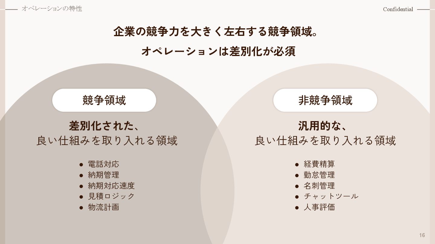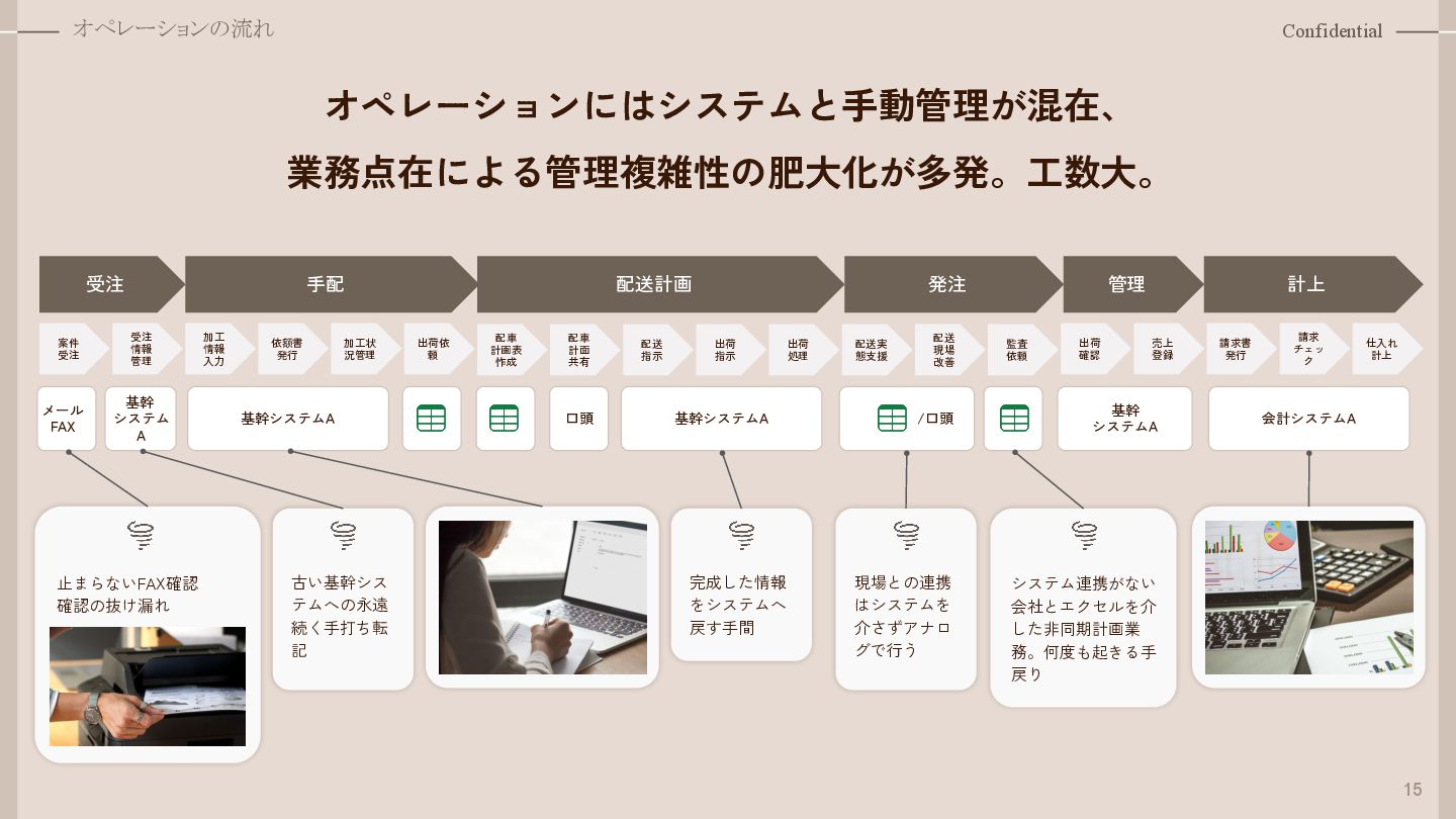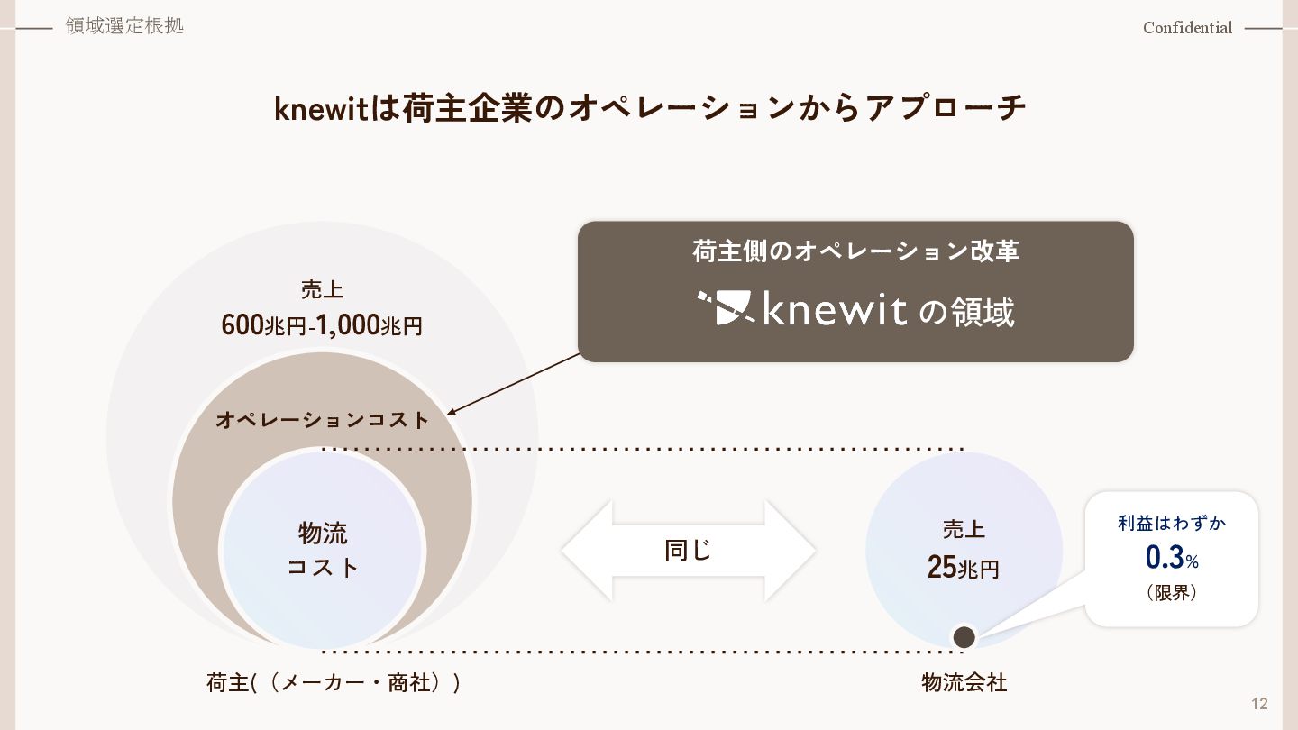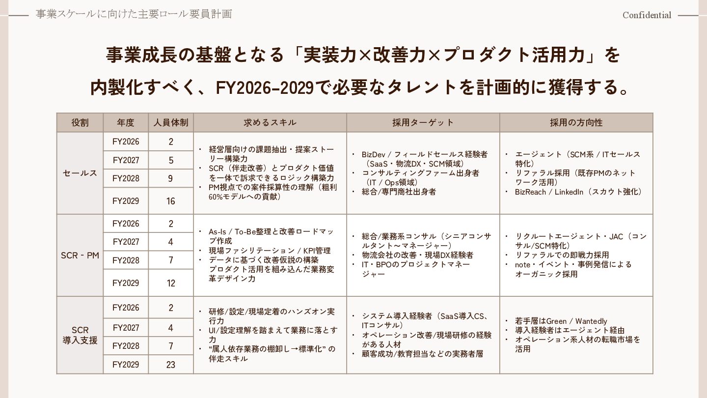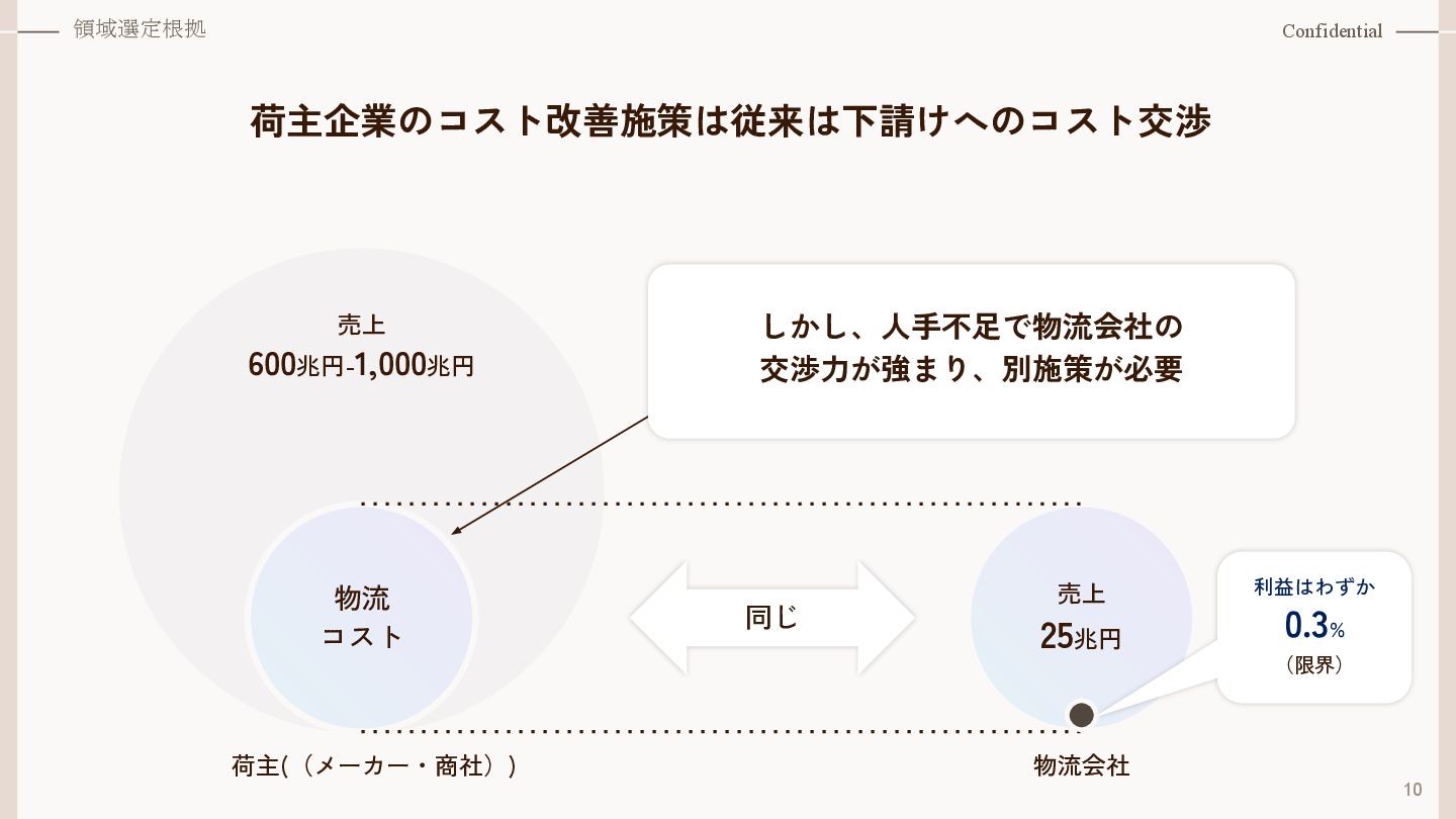 約4,200億 中堅・大企業のオペレーション人件費総額 2.1兆円 市場規模 参考 TAM(Total Addressable Market)の定義 小規模企業はオペレーション人員が少なく、構造的改善によるインパクトが限 定的なため対象外とする。 中堅企業および大企業をTAMの対象とする。 TAM対象人員数: 中堅:269,500人、大企業:115,500人=合計:385,000人 オペレーション人員の平均人件費を以下と設定する。 1人あたり人件費:5,500,000円/年 TAM金額: 385,000人 × 5,500,000円 = 約2.1兆円/年 SOM(Serviceable Obtainable Market)の定義 TAMに含まれるオペレーション業務のうち、 業務改善・効率化により見直し可能な領域を20%と仮定する。 SOM金額: 2.1兆円 × 20% = 約4,200億円 SAM(Serviceable Available Market)の定義 SOMの中から、現実的に狙える市場を以下の条件で絞り込む。 条件① 産業領域 調達・物流オペレーション比重の高い産業(鉄鋼、化学等)を20%と仮定 条件② IT投資意欲 基幹システムや業務基盤のリプレイスに対して意欲のある企業を20~40%と仮 定 SAM金額: 4,200億円 × 20% × 20~40% = 約160~320億円 荷主のオペレーション領域は巨大市場×改善余剰有×専門性高 *2. 企業規模別の内訳 企業数ベース 区分/社数比率/社数/オペレーション人数/合計人数(下限より) 小規模/93%/358,050社/2〜4人/716,100人 中堅/7%/26,950社/10〜30人/269,500人 大企業/0.3%/1,155社/100〜500人/115,500人 *1. 市場母数の定義 国内のメーカー・商社は合計55万社とする。 メーカー:約34万社、商社:約21万社 このうち、業務オペレーションに一定の仕組み(業務プロセスやシステム)を取り入れている企業を70%と仮定する。 紙運用のみ、家族経営中心など、構造的な業務改善余地が乏しい企業は除外する。 対象企業数:55万社 × 70% = 約38.5万社 市場性