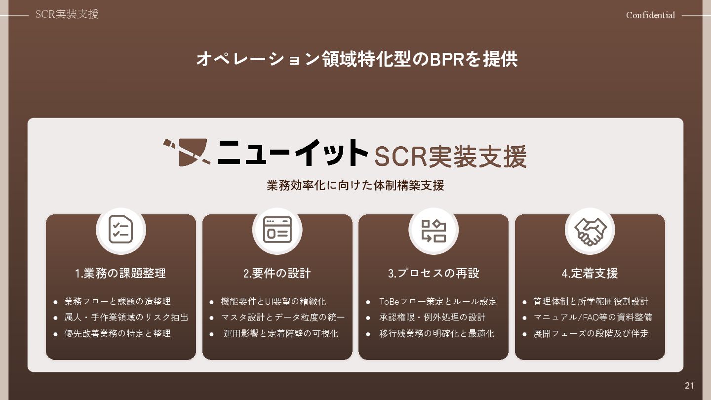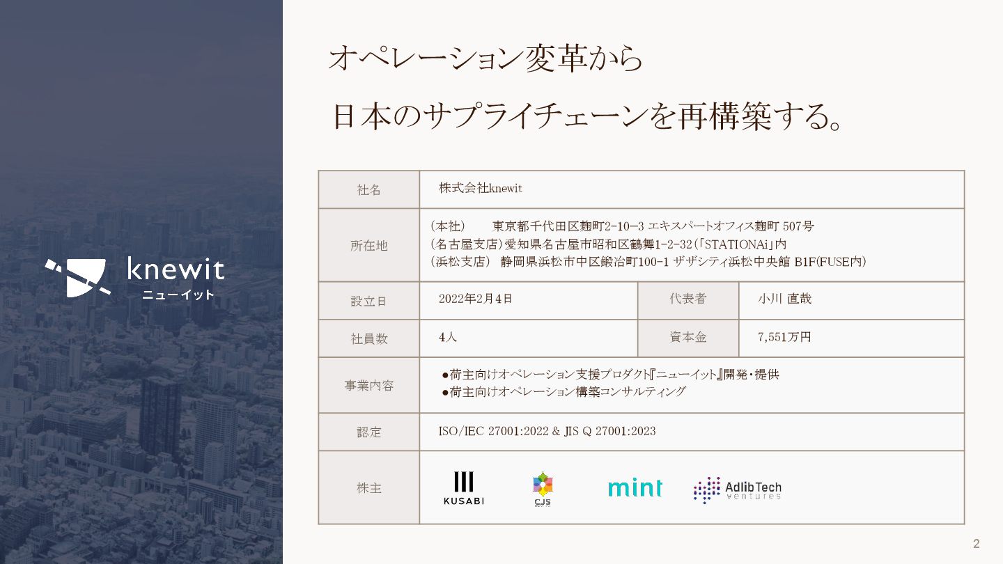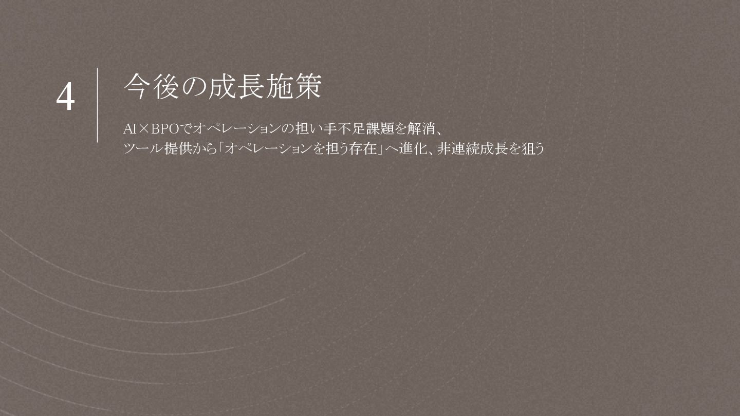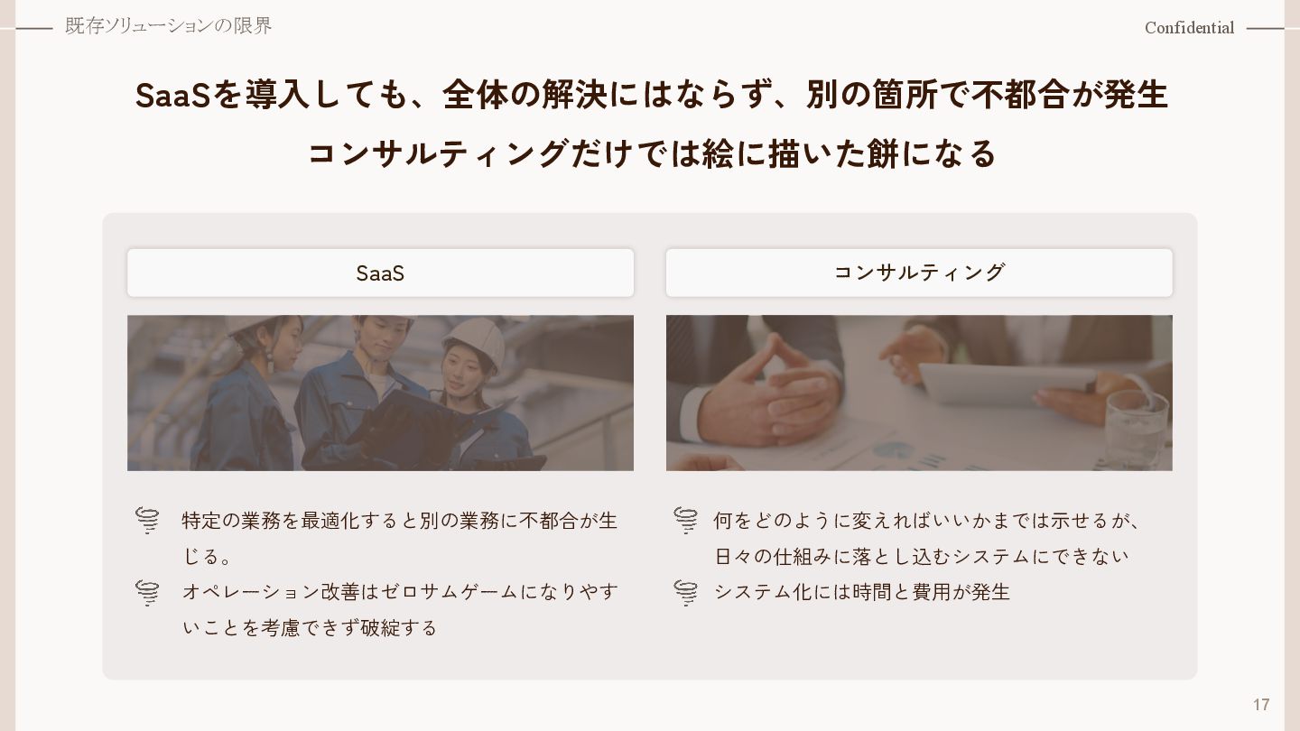 約4,200億 中堅・大企業のオペレーション人件費総額 2.1兆円 市場規模 参考 TAM(Total Addressable Market)の定義 小規模企業はオペレーション人員が少なく、構造的改善によるインパクトが限 定的なため対象外とする。 中堅企業および大企業をTAMの対象とする。 TAM対象人員数: 中堅:269,500人、大企業:115,500人=合計:385,000人 オペレーション人員の平均人件費を以下と設定する。 1人あたり人件費:5,500,000円/年 TAM金額: 385,000人 × 5,500,000円 = 約2.1兆円/年 SOM(Serviceable Obtainable Market)の定義 TAMに含まれるオペレーション業務のうち、 業務改善・効率化により見直し可能な領域を20%と仮定する。 SOM金額: 2.1兆円 × 20% = 約4,200億円 SAM(Serviceable Available Market)の定義 SOMの中から、現実的に狙える市場を以下の条件で絞り込む。 条件① 産業領域 調達・物流オペレーション比重の高い産業(鉄鋼、化学等)を20%と仮定 条件② IT投資意欲 基幹システムや業務基盤のリプレイスに対して意欲のある企業を20~40%と仮 定 SAM金額: 4,200億円 × 20% × 20~40% = 約160~320億円 荷主のオペレーション領域は巨大市場×改善余剰有×専門性高 *2. 企業規模別の内訳 企業数ベース 区分/社数比率/社数/オペレーション人数/合計人数(下限より) 小規模/93%/358,050社/2〜4人/716,100人 中堅/7%/26,950社/10〜30人/269,500人 大企業/0.3%/1,155社/100〜500人/115,500人 *1. 市場母数の定義 国内のメーカー・商社は合計55万社とする。 メーカー:約34万社、商社:約21万社 このうち、業務オペレーションに一定の仕組み(業務プロセスやシステム)を取り入れている企業を70%と仮定する。 紙運用のみ、家族経営中心など、構造的な業務改善余地が乏しい企業は除外する。 対象企業数:55万社 × 70% = 約38.5万社 市場性