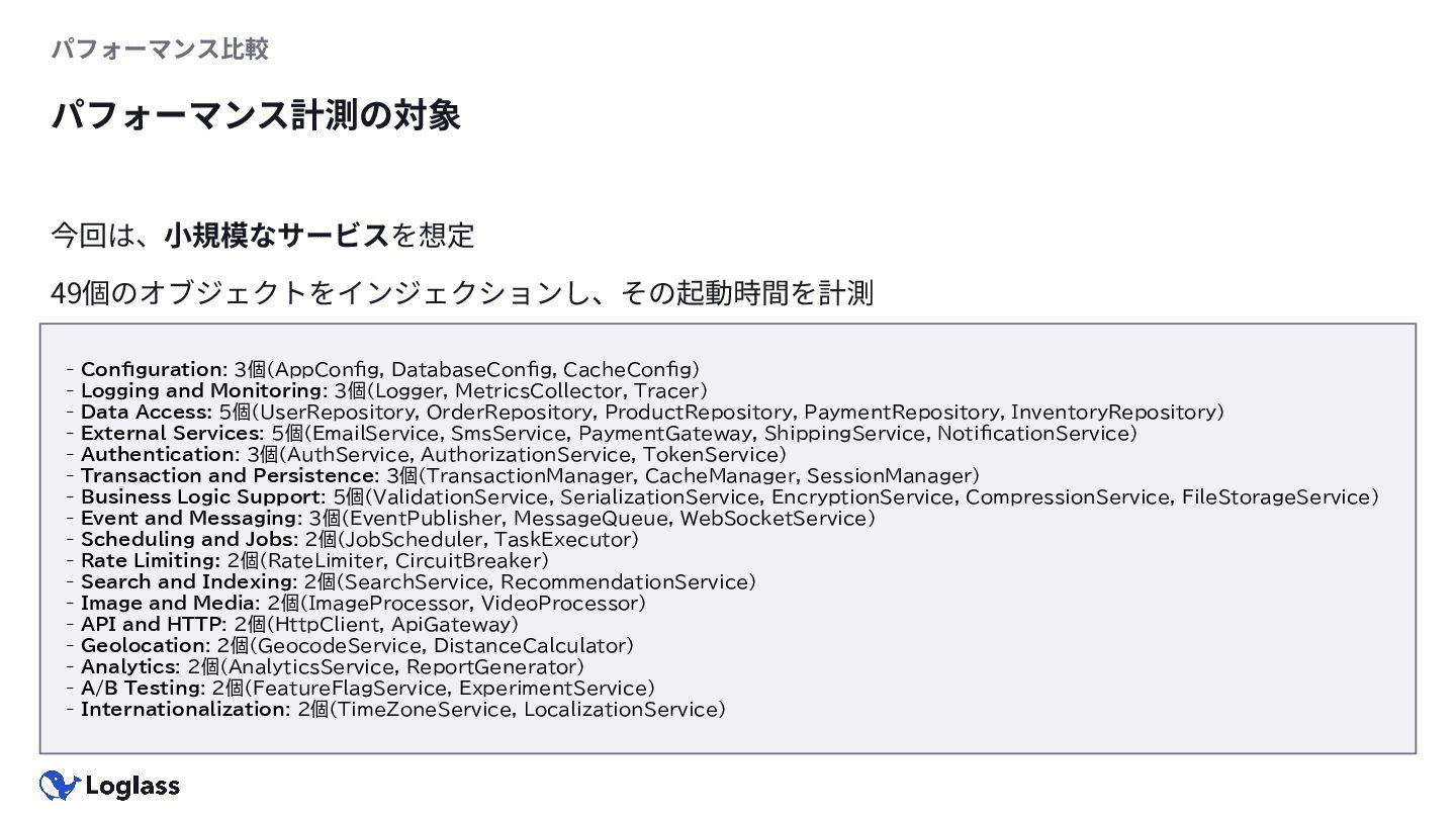 Logging and Monitoring: 3個(Logger, MetricsCollector, Tracer) - Data Access: 5個(UserRepository, OrderRepository, ProductRepository, PaymentRepository, InventoryRepository) - External Services: 5個(EmailService, SmsService, PaymentGateway, ShippingService, NotificationService) - Authentication: 3個(AuthService, AuthorizationService, TokenService) - Transaction and Persistence: 3個(TransactionManager, CacheManager, SessionManager) - Business Logic Support: 5個(ValidationService, SerializationService, EncryptionService, CompressionService, FileStorageService) - Event and Messaging: 3個(EventPublisher, MessageQueue, WebSocketService) - Scheduling and Jobs: 2個(JobScheduler, TaskExecutor) - Rate Limiting: 2個(RateLimiter, CircuitBreaker) - Search and Indexing: 2個(SearchService, RecommendationService) - Image and Media: 2個(ImageProcessor, VideoProcessor) - API and HTTP: 2個(HttpClient, ApiGateway) - Geolocation: 2個(GeocodeService, DistanceCalculator) - Analytics: 2個(AnalyticsService, ReportGenerator) - A/B Testing: 2個(FeatureFlagService, ExperimentService) - Internationalization: 2個(TimeZoneService, LocalizationService)