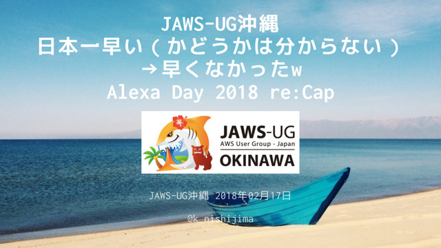 https://jaws-ug-okinawa.doorkeeper.jp/events/69661 JAWS-UG沖縄 日本一早い(かどうかは分からない)Alexa Day 2018 re:Cap 2018年02月