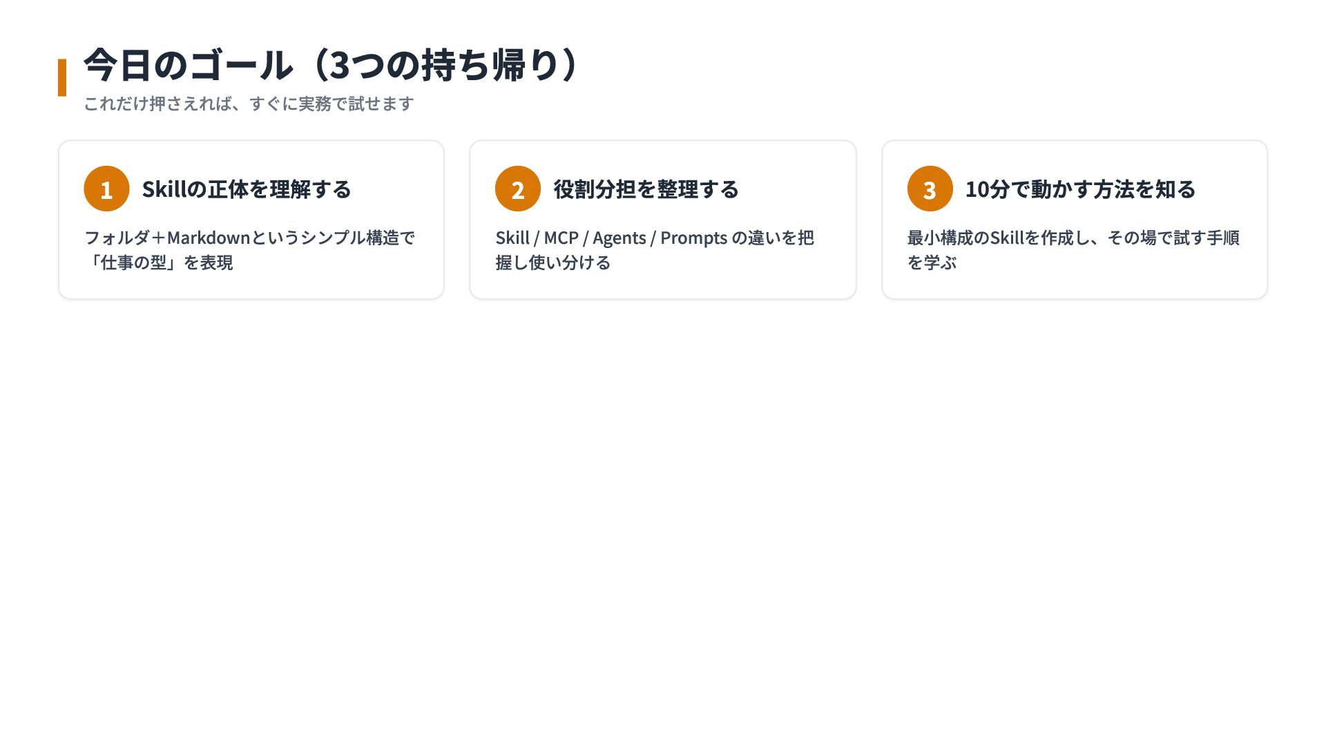 今日のゴール(3つの持ち帰り) これだけ押さえれば、すぐに実務で試せます 1 Skillの正体を理解する フォルダ+Markdownというシンプル構造で 「仕事の型」を表現 2 役割分担を整理する Skill /