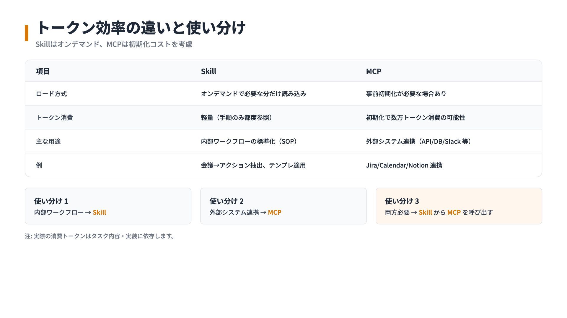 初期化で数万トークン消費の可能性 主な用途 内部ワークフローの標準化(SOP) 外部システム連携(API/DB/Slack 等) 例 会議→アクション抽出、テンプレ適用 Jira/Calendar/Notion 連携 使い分け 1 内部ワークフロー → Skill 使い分け 2 外部システム連携 → MCP 使い分け 3 両方必要 → Skill から MCP を呼び出す 注: 実際の消費トークンはタスク内容・実装に依存します。