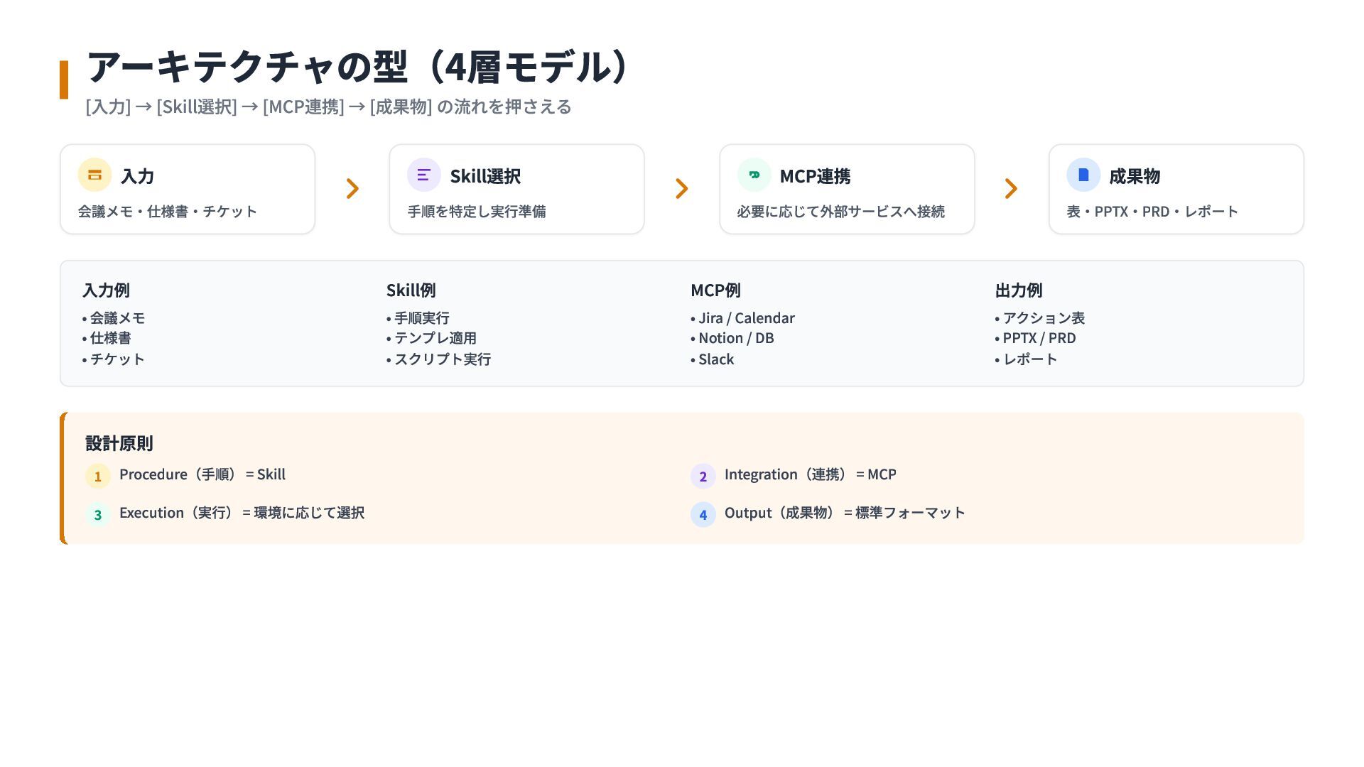 アーキテクチャの型(4層モデル) [入力] → [Skill選択] → [MCP連携] → [成果物] の流れを押さえる 入力