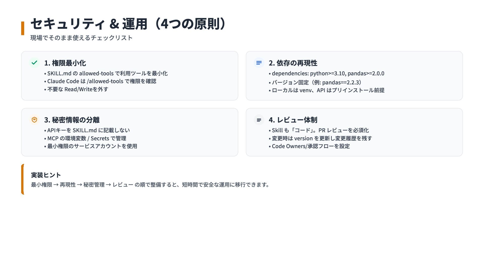 セキュリティ & 運用(4つの原則) 現場でそのまま使えるチェックリスト 1. 権限最小化 • SKILL.md の allowed-tools