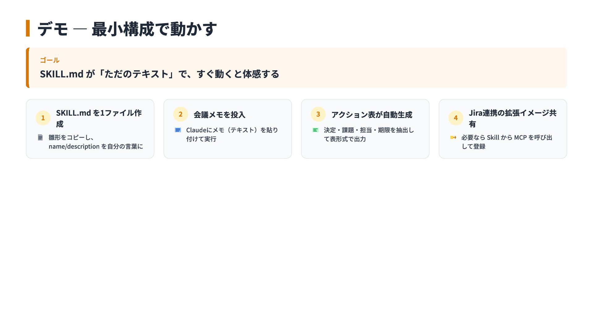 雛形をコピーし、 name/description を自分の言葉に 2 会議メモを投入 Claudeにメモ(テキスト)を貼り 付けて実行 3 アクション表が自動生成 決定・課題・担当・期限を抽出し て表形式で出力 4 Jira連携の拡張イメージ共 有 必要なら Skill から MCP を呼び出 して登録