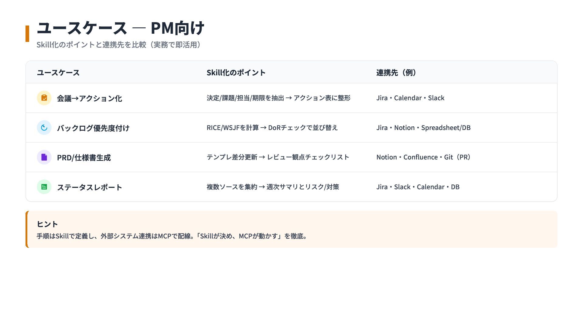 ユースケース — PM向け Skill化のポイントと連携先を比較(実務で即活用) ユースケース Skill化のポイント 連携先(例) 会議→アクション化 決定/課題/担当/期限を抽出 →