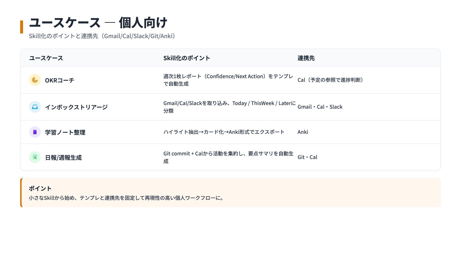 ユースケース — 個人向け Skill化のポイントと連携先(Gmail/Cal/Slack/Git/Anki) ユースケース Skill化のポイント 連携先 OKRコーチ 週次1枚レポート(Confidence/Next Action)をテンプレ