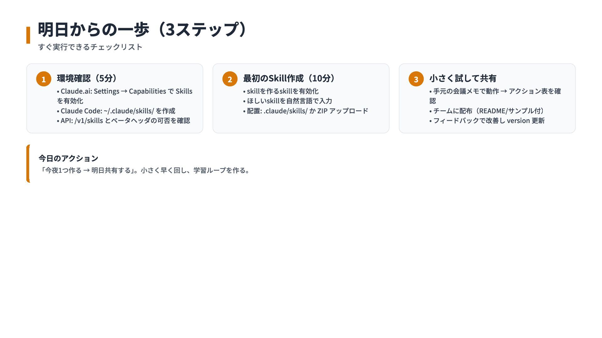 Skills を有効化 • Claude Code: ~/.claude/skills/ を作成 • API: /v1/skills とベータヘッダの可否を確認 2 最初のSkill作成(10分) • skillを作るskillを有効化 • ほしいskillを自然言語で入力 • 配置: .claude/skills/ か ZIP アップロード 3 小さく試して共有 • 手元の会議メモで動作 → アクション表を確 認 • チームに配布(README/サンプル付) • フィードバックで改善し version 更新 今日のアクション 「今夜1つ作る → 明日共有する」 。小さく早く回し、学習ループを作る。